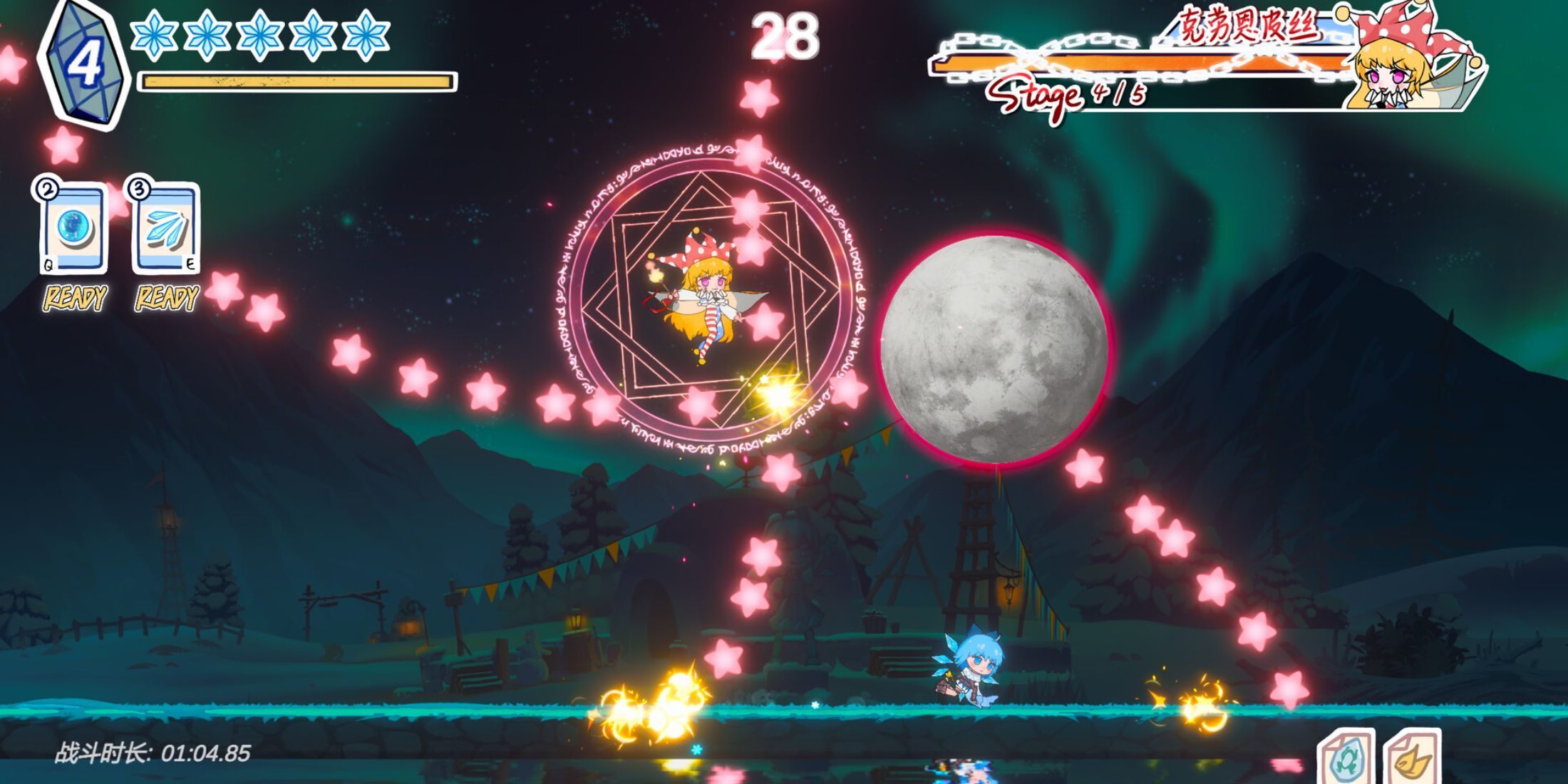 In Touhou: Hero of Ice Fairy, the popular character Cirno takes center stage as the main character in this fast-paced, bullet-hell game. The game captures Cirno’s playful personality with a mix of lighthearted humor and difficult challenges, staying true to her role as a charming, yet mischievous fairy while providing an exciting gameplay experience.