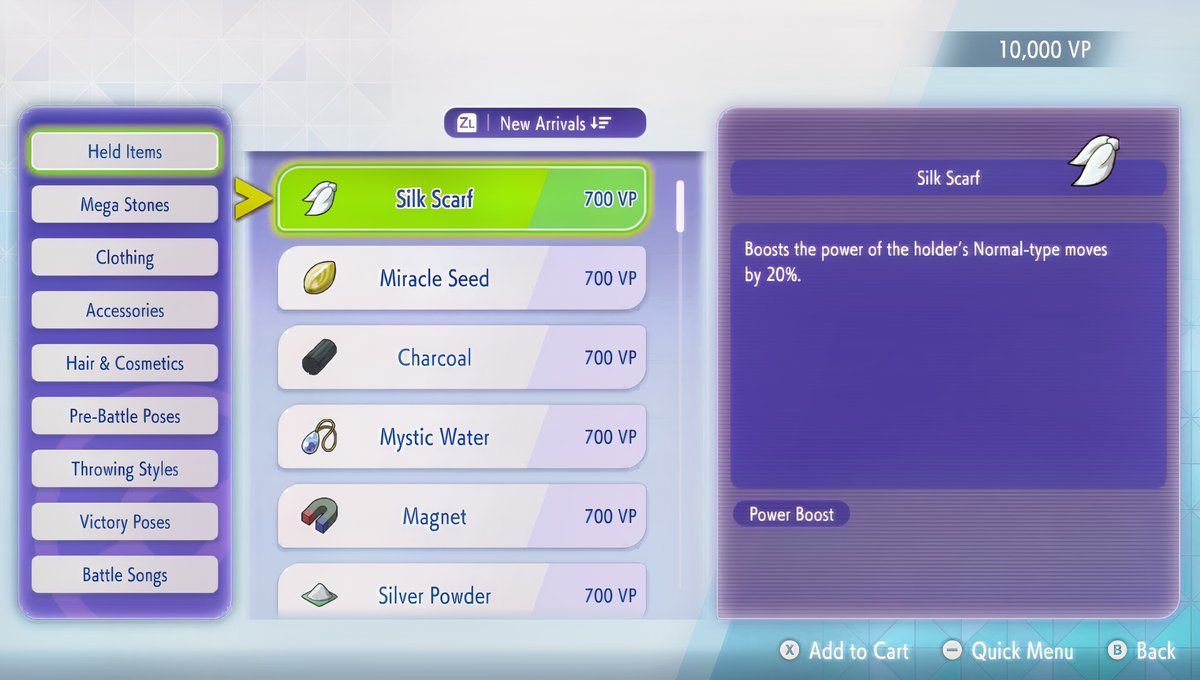 B Silk Scarf, Mystic Water, Charcoal, Magnet, Dragon Fang, Black Glasses, Sharp Beak, Fairy Feather, Metal Coat, Soft Sand, Poison Barb, Never-Melt Ice, Spell Tag, Aspear Berry, Rawst Berry, Chesto Berry, Cheri Berry, Focus Band