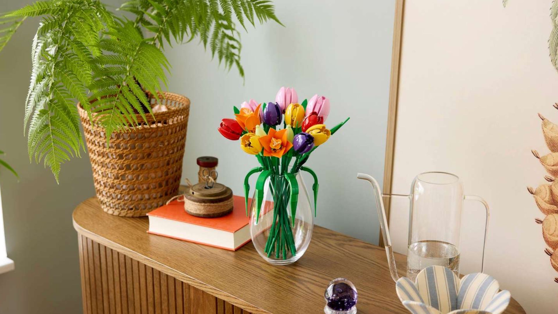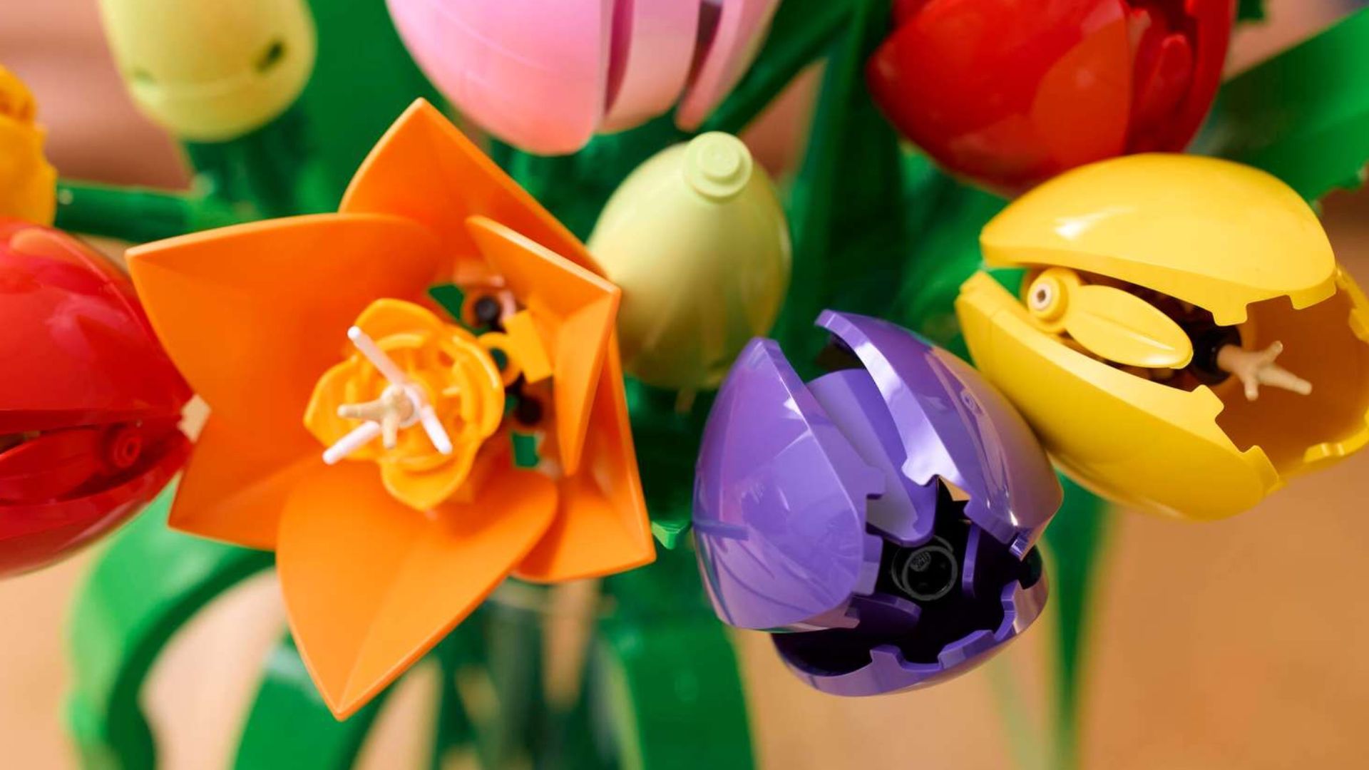 This LEGO Tulip Bouquet is a stunning addition to any flower collection. Its bright oranges, yellows, purples, reds, and pinks really pop against the dark green stems, creating a beautiful display. The set includes five different tulip colors, adding extra visual interest. Even if they were all the same color, it would still be lovely, but the mix of shades makes it truly special. The best LEGO displays are both eye-catching and realistic, and this Tulip Bouquet achieves that perfect balance.