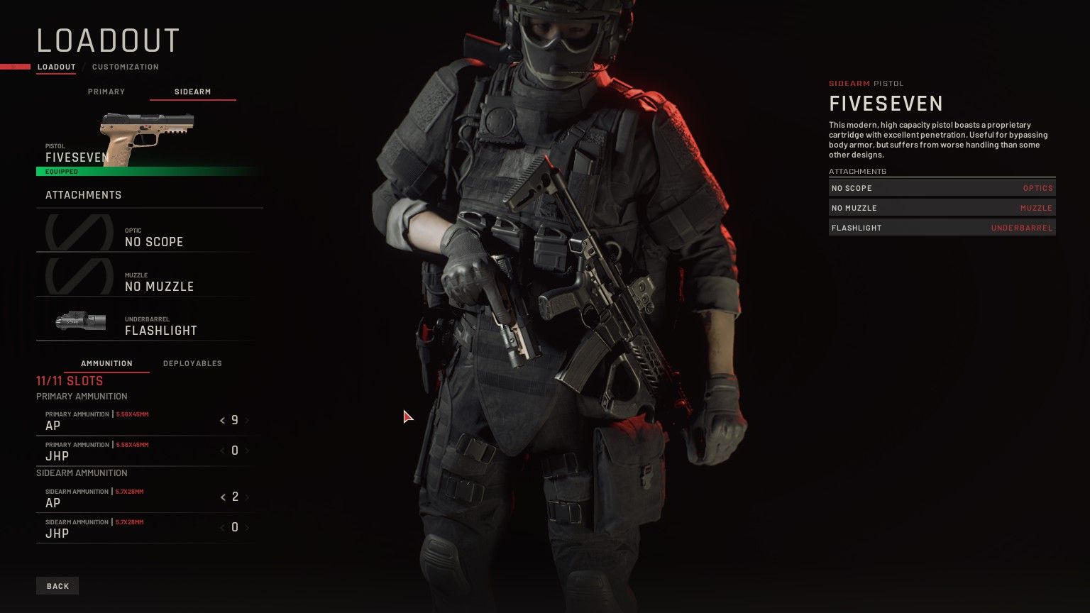 Secondary Weapon | Five-Seven with flashlight and optional red dot sight |
