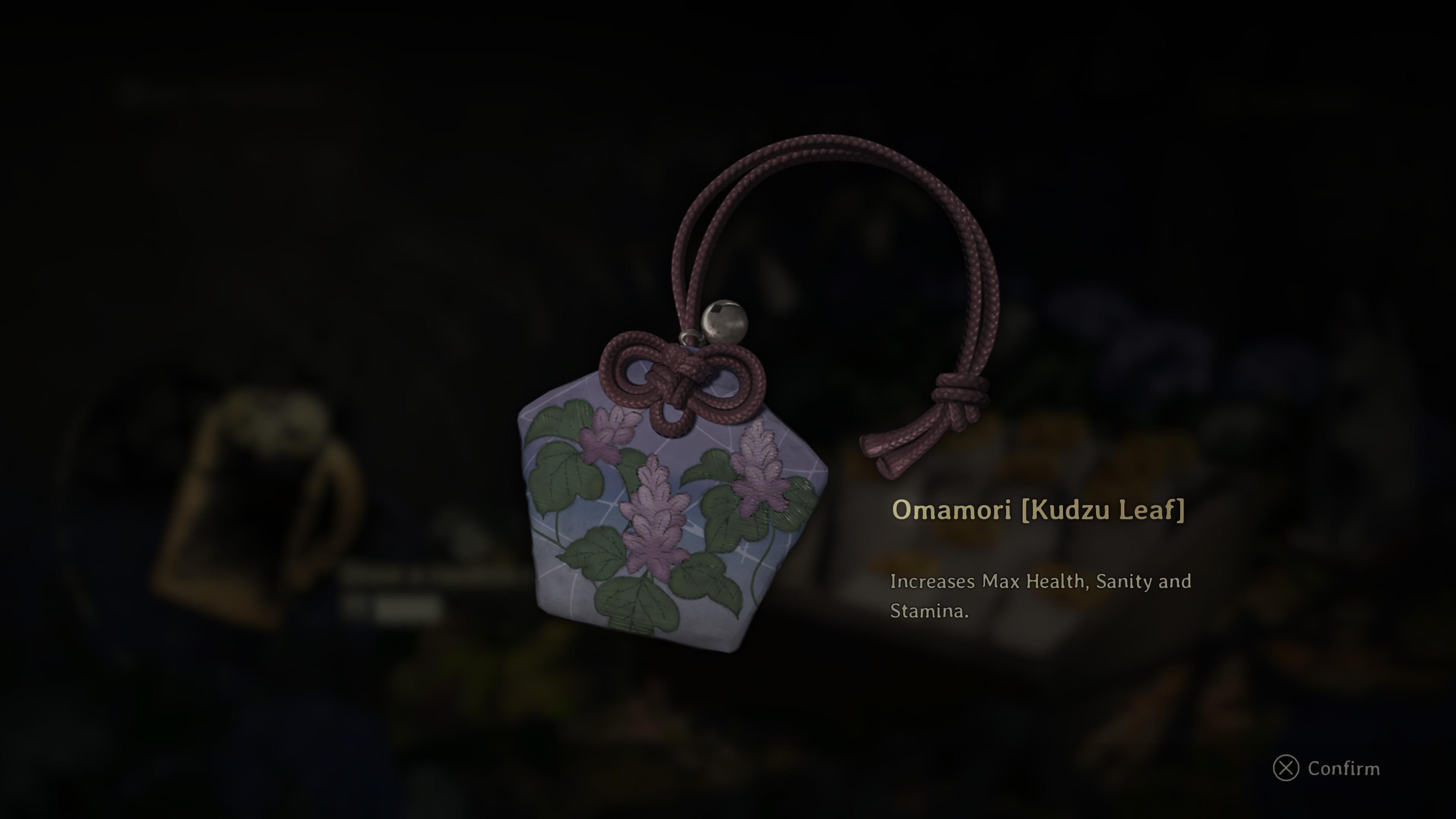 The Kudzu Leaf Omamori is really useful when you’re starting out, particularly if you haven’t collected many Ema to improve your Health, Stamina, or Sanity. You can obtain it by chance from a drawing at a shrine (hokora).
