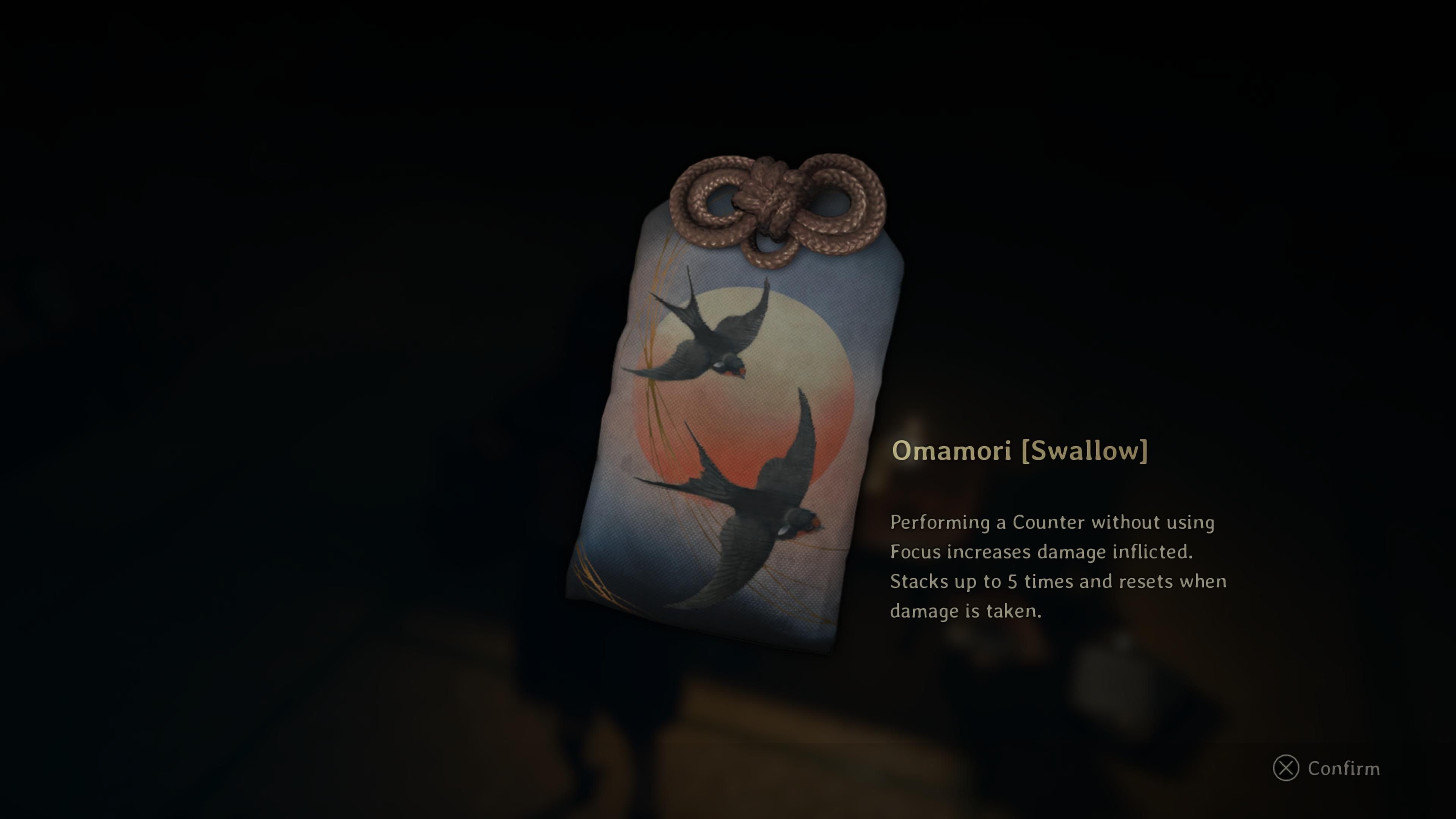 Inside, you’ll find extra story details and the Swallow Omamori. This charm boosts your attack power each time you successfully counter an enemy, and the effect can build up to five times, making Hinako incredibly strong.