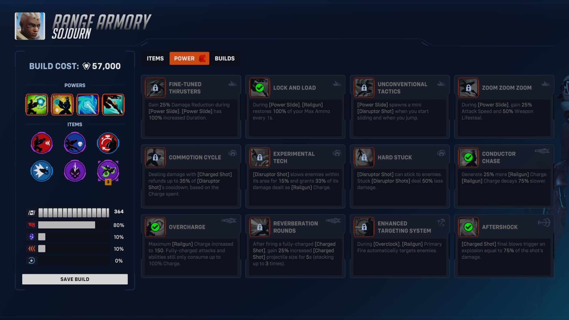 To get the most out of Sojourn in Stadium, focus on building her weapon damage – especially her rifle and fully charged Railgun shots. A great starting point for any Sojourn build is the Overcharge Power. It’s her most powerful ability, letting her charge her Railgun to 150 without making charged shots more expensive.