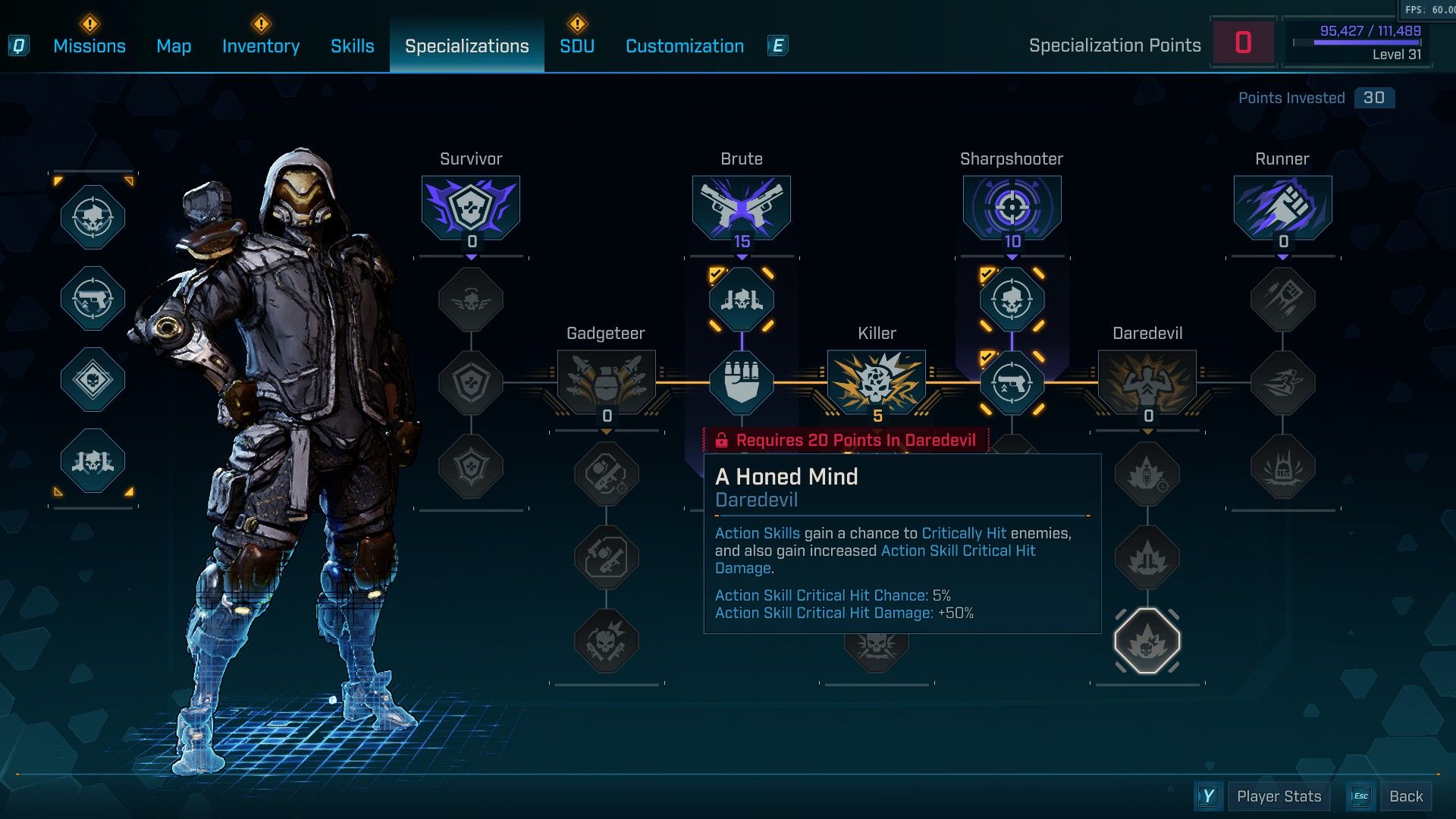 For this character setup, the Daredevil Specialization path is ideal as it boosts your Action Skill considerably. Immediately invest 10 points each into Sharpshooter and Runner for your Action Skill. After that, maximize points in Daredevil. This build already has great power without Specializations, but they’ll make Rafa even more formidable than he currently is.