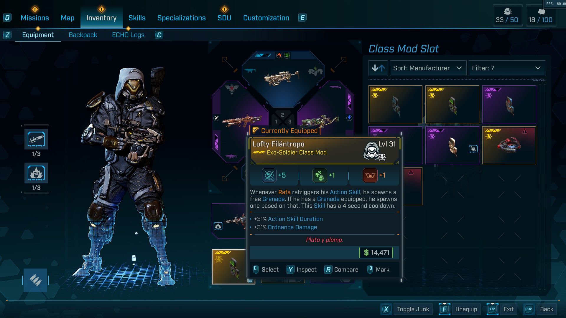 In case you can’t obtain the Filantropo Legendary Class Mod, opt for one that offers any of the benefits mentioned previously. The Filantropo mod isn’t essential for this build, but it does enhance fighting enemies when combined with an effective Grenade mod. If you prefer Ordnance weapons, a high-quality purple Class Mod with favorable stats and additional skills will serve you better than a Legendary class mod in this scenario.