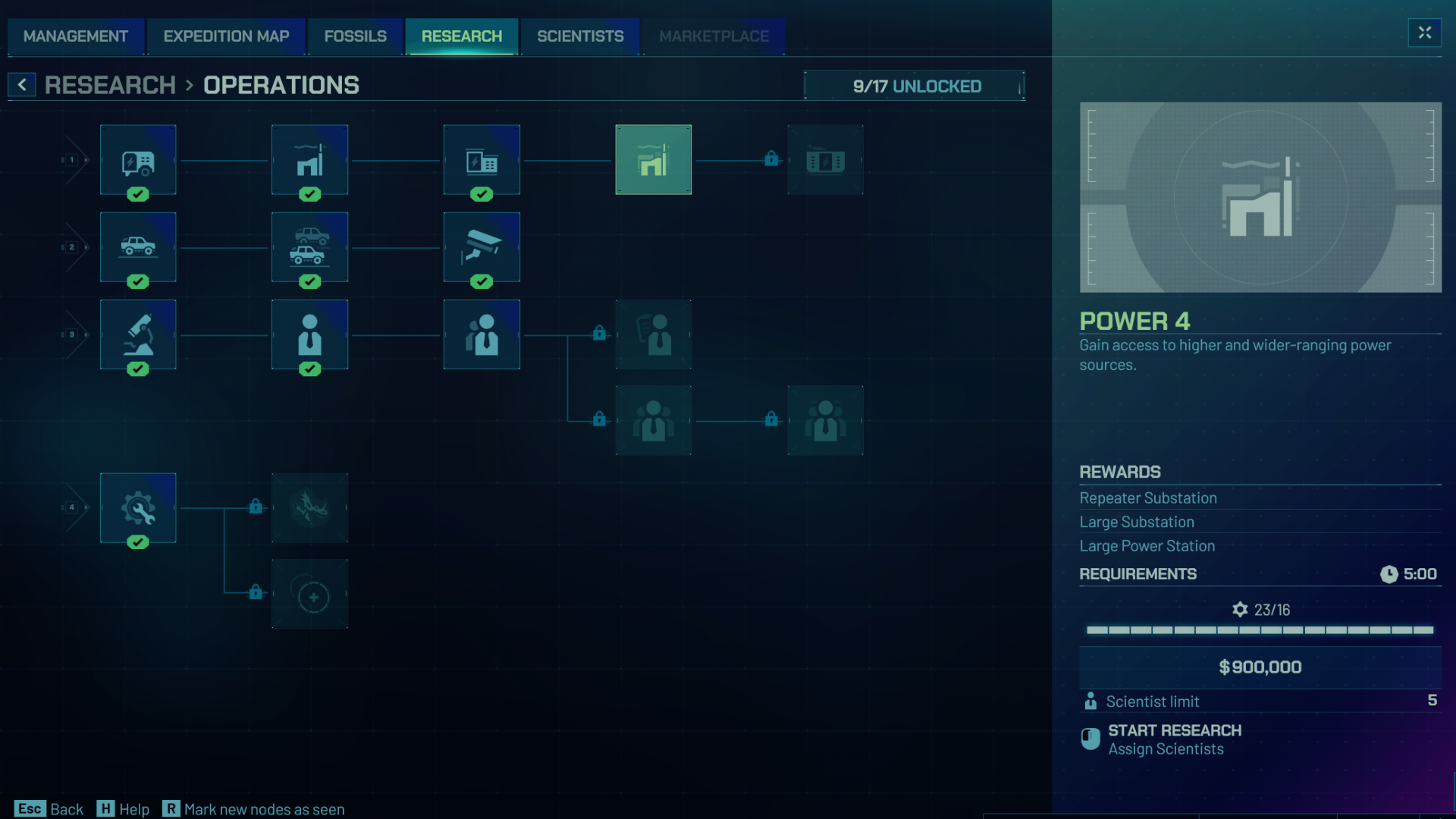 The Operations research tree is a great choice no matter what you’re trying to achieve. It allows your scientists to research improvements to power, your Staff Center, and security cameras. Upgrading power lets you switch from less efficient Backup Generators to more powerful options like Substations and Pylons. Improving the Staff Center boosts your scientists’ skills, and Security Cameras will automatically send Ranger Teams to deal with any threats near your enclosures.