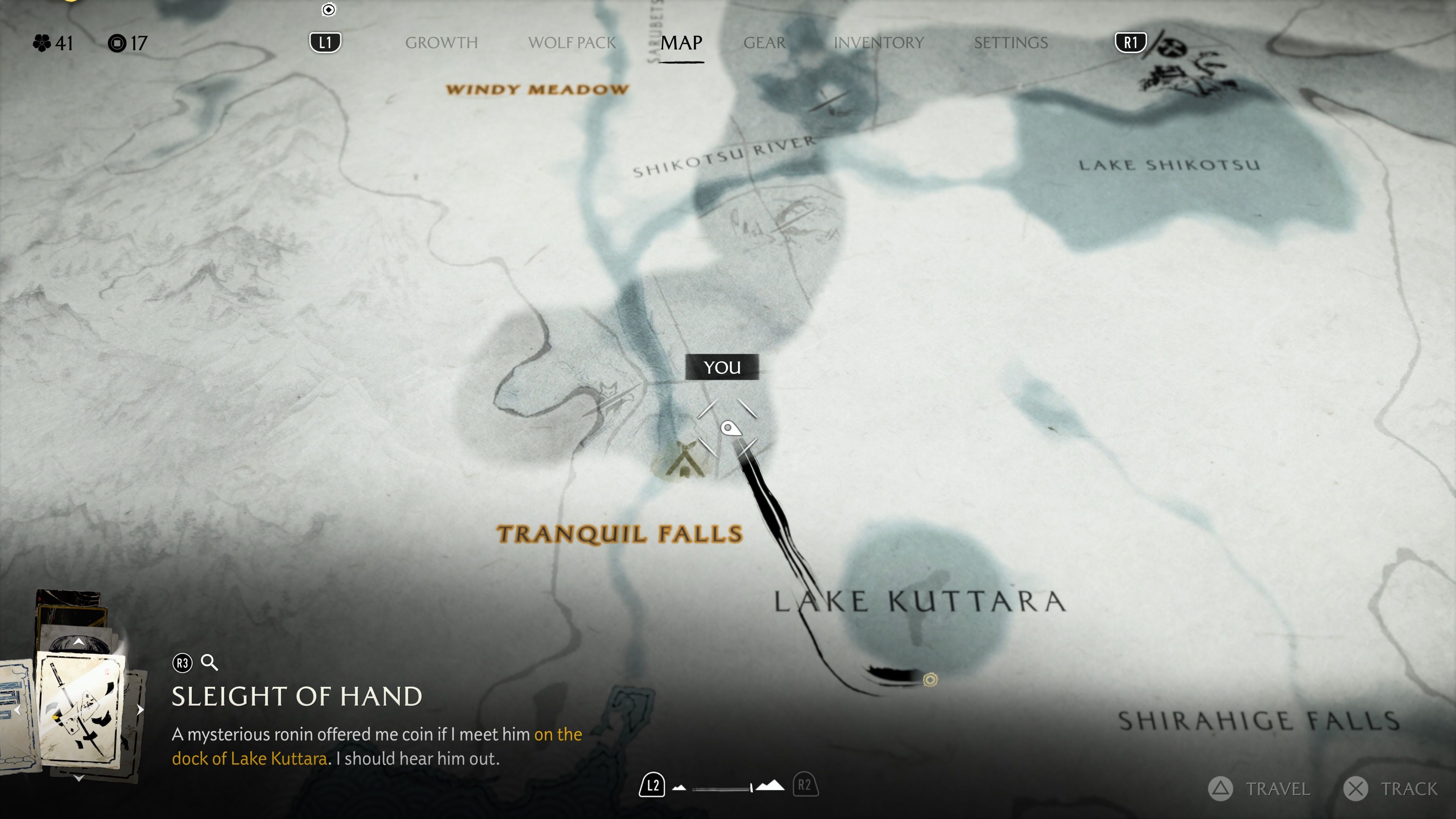 Just south of the first Dueling Tree, near Tranquil Falls, players can find an NPC known only as Ronin at his camp. He’ll ask players to travel to Lake Kuttara, beginning the Sleight of Hand quest. Unfortunately, Saito’s Outlaws have currently occupied his inn, the Kuttara Gambling Den.
