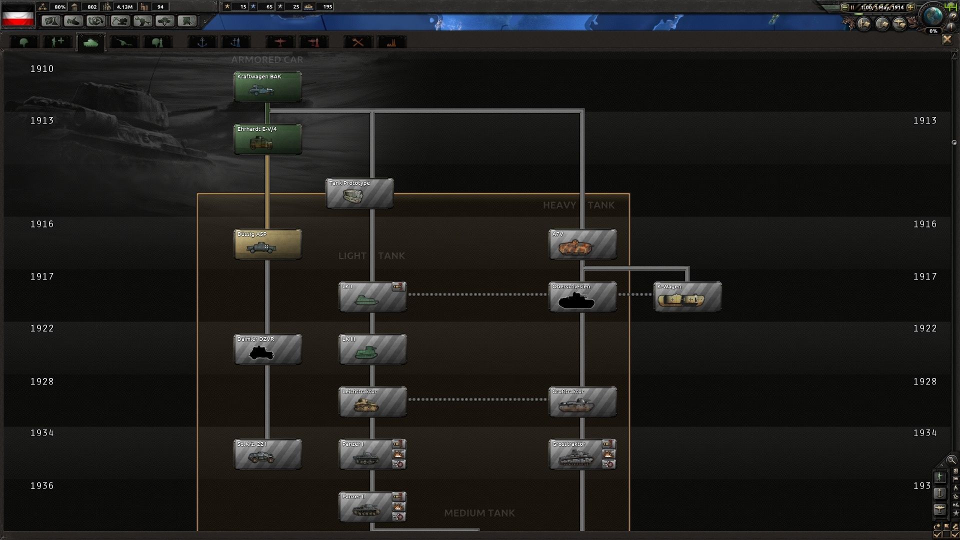 Often, less is more, and the Great War mod perfectly captures that idea. It immerses players in the harsh reality of World War I trenches, with realistic challenges like mud, constant losses, and a feeling that progress is slow and costly. The game’s technology tree also accurately reflects the slow, grinding nature of warfare in the early 1900s.