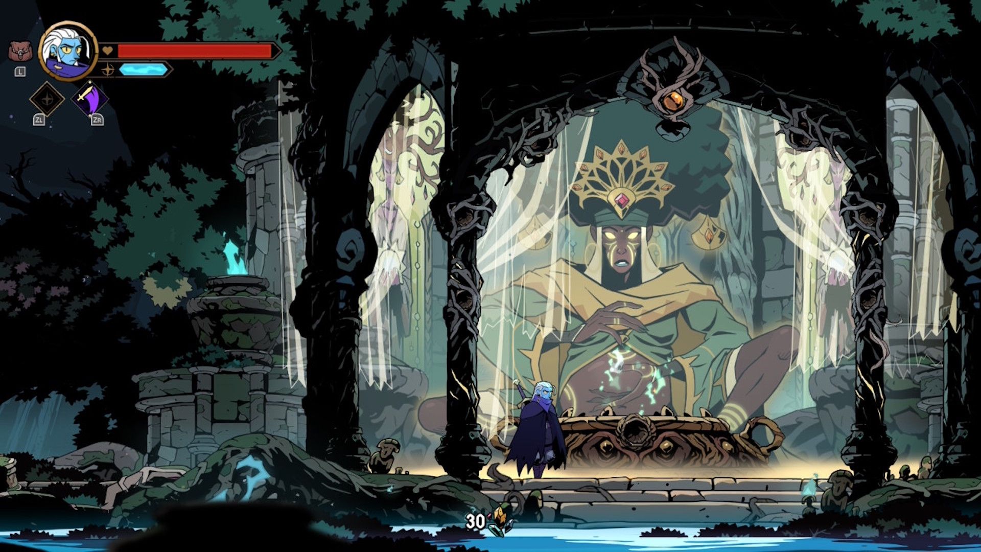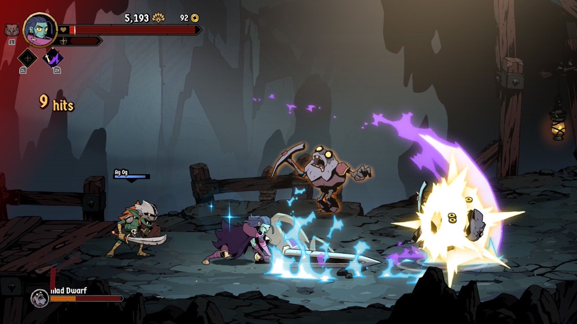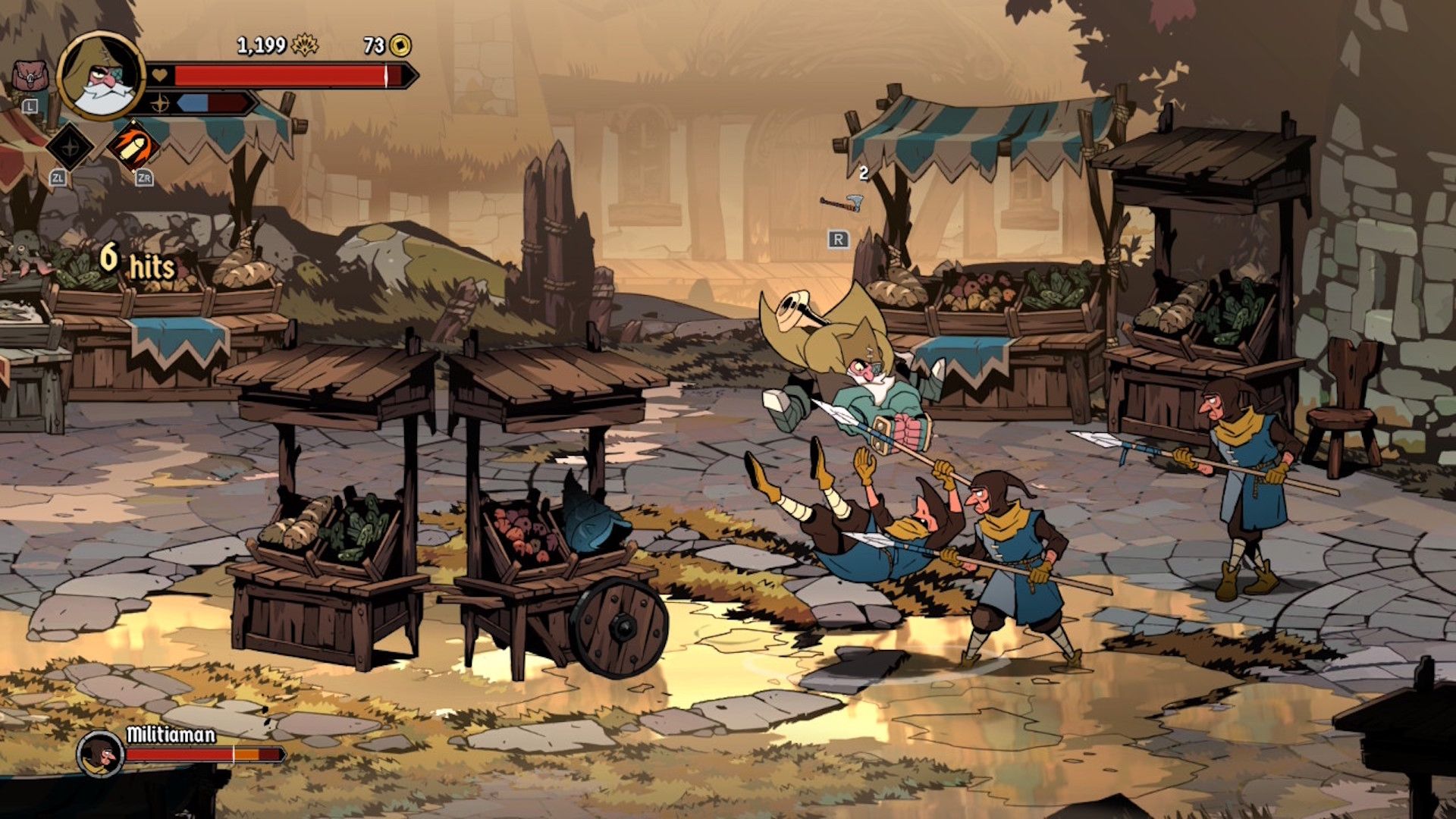 Absolum is a classic beat ‘em up game with elements of roguelikes, meaning each playthrough is different. You start by choosing one of two characters, with more becoming available as you play. Galandra is a strong, magic-wielding swordfighter, and Karl is a quick, close-combat fighter who also uses a gun. Each character has standard attacks and special abilities that have cooldowns. During a run, you can find temporary power-ups, and between runs, you can permanently improve your characters in the game’s central hub.
