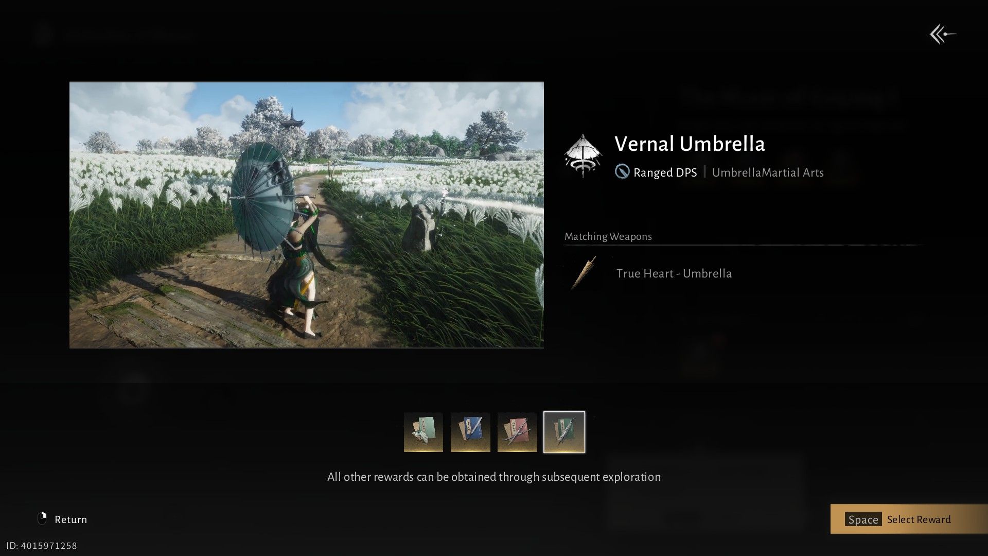 | Unfading Flower | When you have at least 50 Blossom, you can use this skill to make your umbrella follow you and attack enemies automatically. While in this state, you can use your other weapon to attack, or use a sword hidden within your umbrella. |