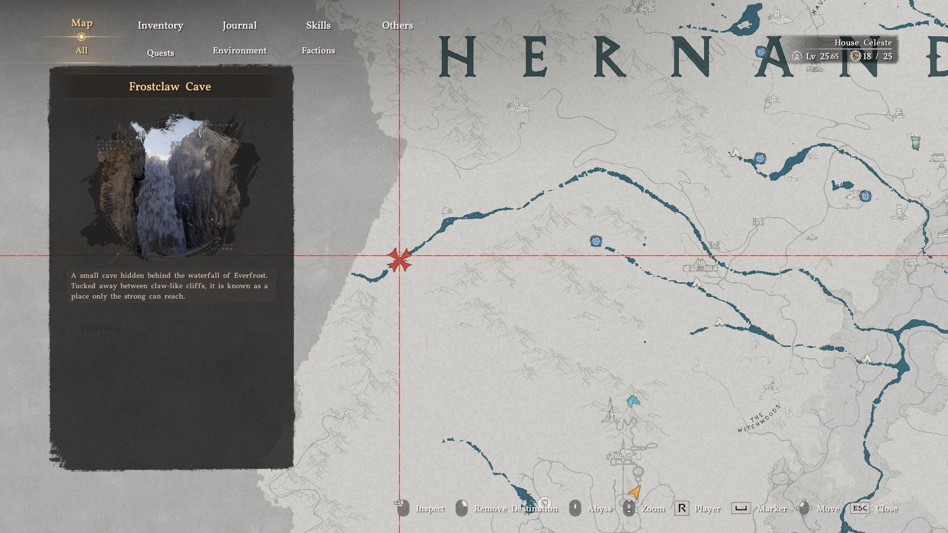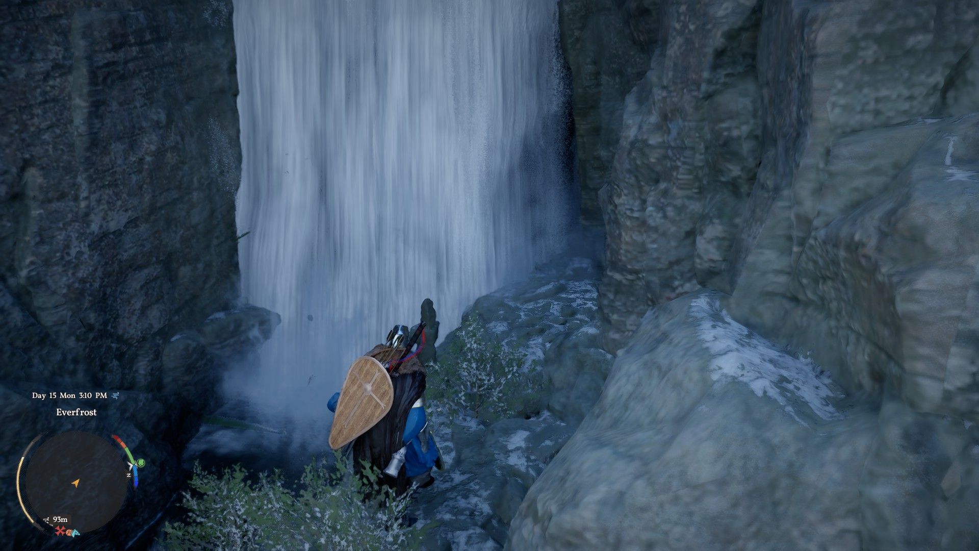 You can find the boots inside Frostclaw Cave, which is located south of Hoenmark Ruins and marked on the map. Swim upstream from the cave’s location until you see a small rock totem – that’s the entrance. To get in, stand directly in front of the waterfall and use a Stab attack to break through the water. Once inside, open the chest to claim the Plate Boots of the Shadows.