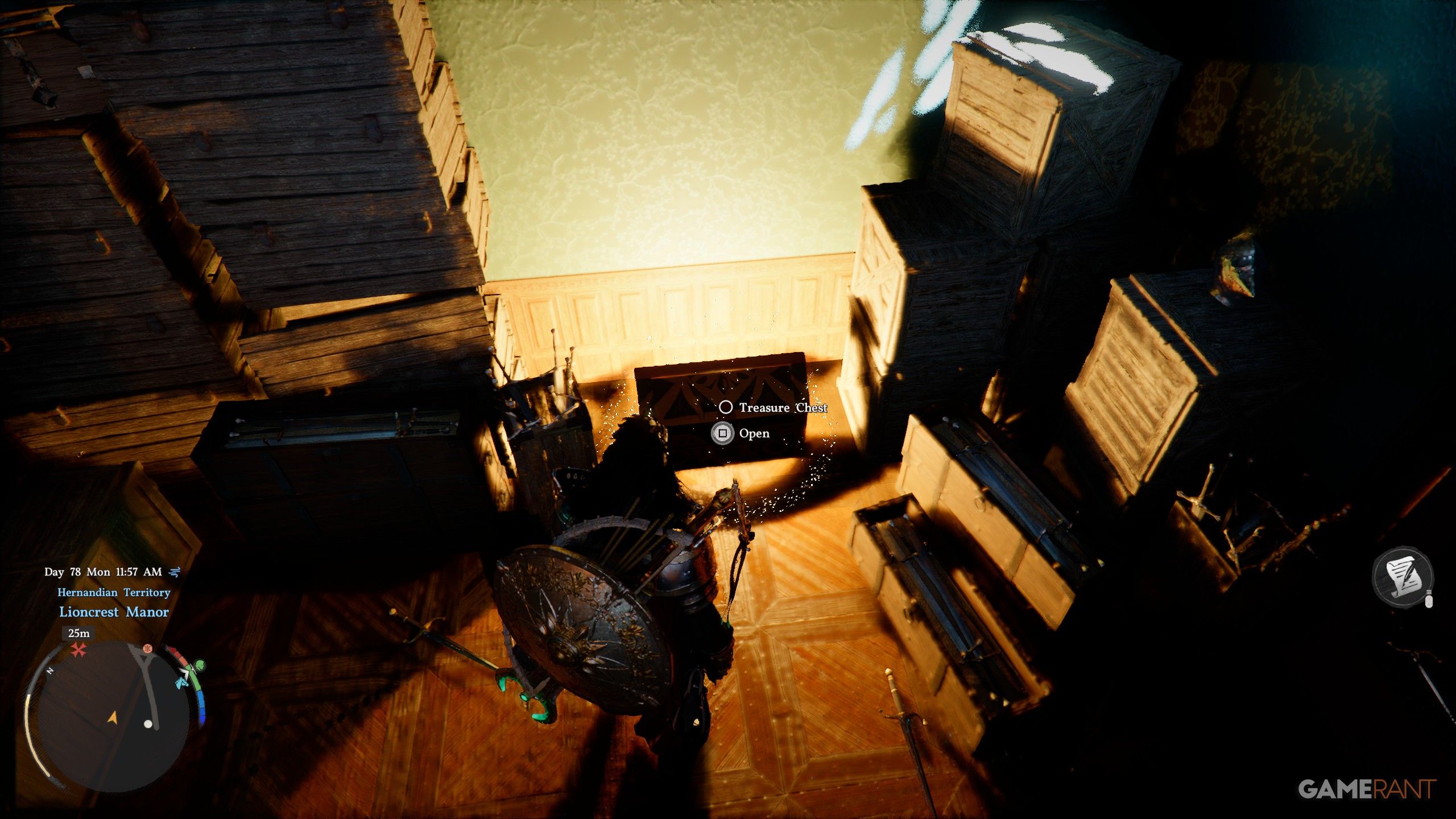 The Hwando is a curved, single-edged sword from ancient Korea, similar in style to a katana. In the game Crimson Desert, you can find it in the storehouse near Lioncrest Manor, which is northwest of Hernand’s town. To get the sword, climb through one of the windows on the second floor of the storehouse and search for a gold chest on the first floor.