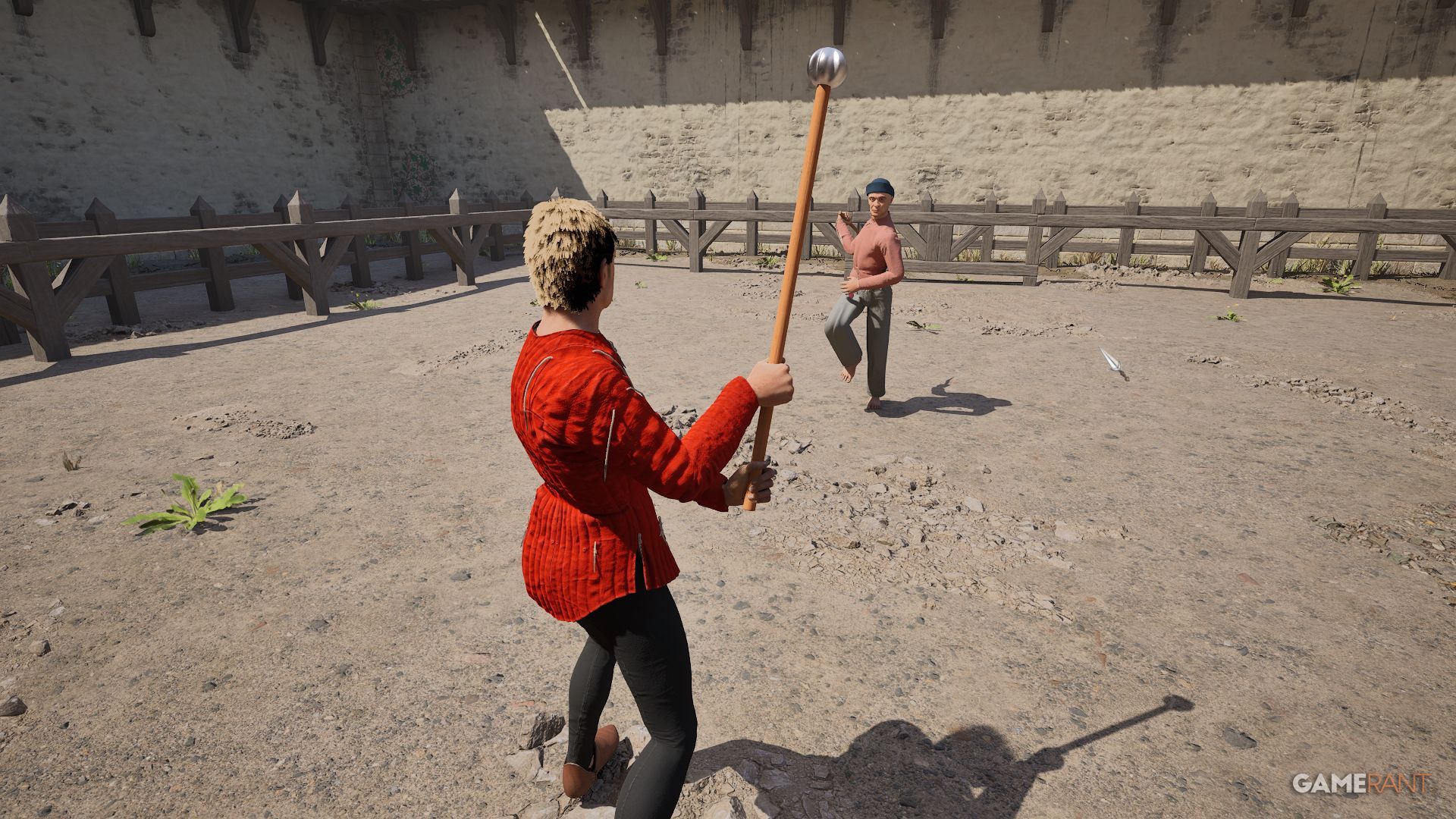 The pitchfork doesn’t do a lot of damage, but it’s very useful at the beginning of the game because it can hit enemies from far away and covers a large area. You can use it to knock down opponents without armor and then make them give up. For the best control, hold the pitchfork in the middle – you use the same button as half-swording (right-mouse button).