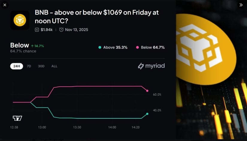 Despite all this “recovery” talk, traders are still acting like they just got dumped. Myriad Markets’ latest forecast shows 64.7% of people think BNB is going to stay below $1,069 until Friday. Only 35.3% are holding out hope for something more. Talk about a party split. 🎉