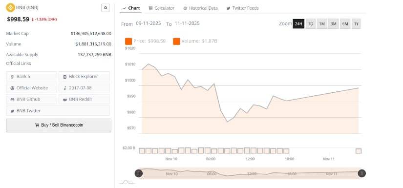Right now, Binance Coin is hovering around $998.59. It’s down 1.53% in the last 24 hours, like a bad mood that you can’t shake. It briefly hit $1,010, then dropped back to $980-$990. This is where the drama happens-buyers are stepping in, saying “Nope, not today, $980 isn’t gonna break us!”