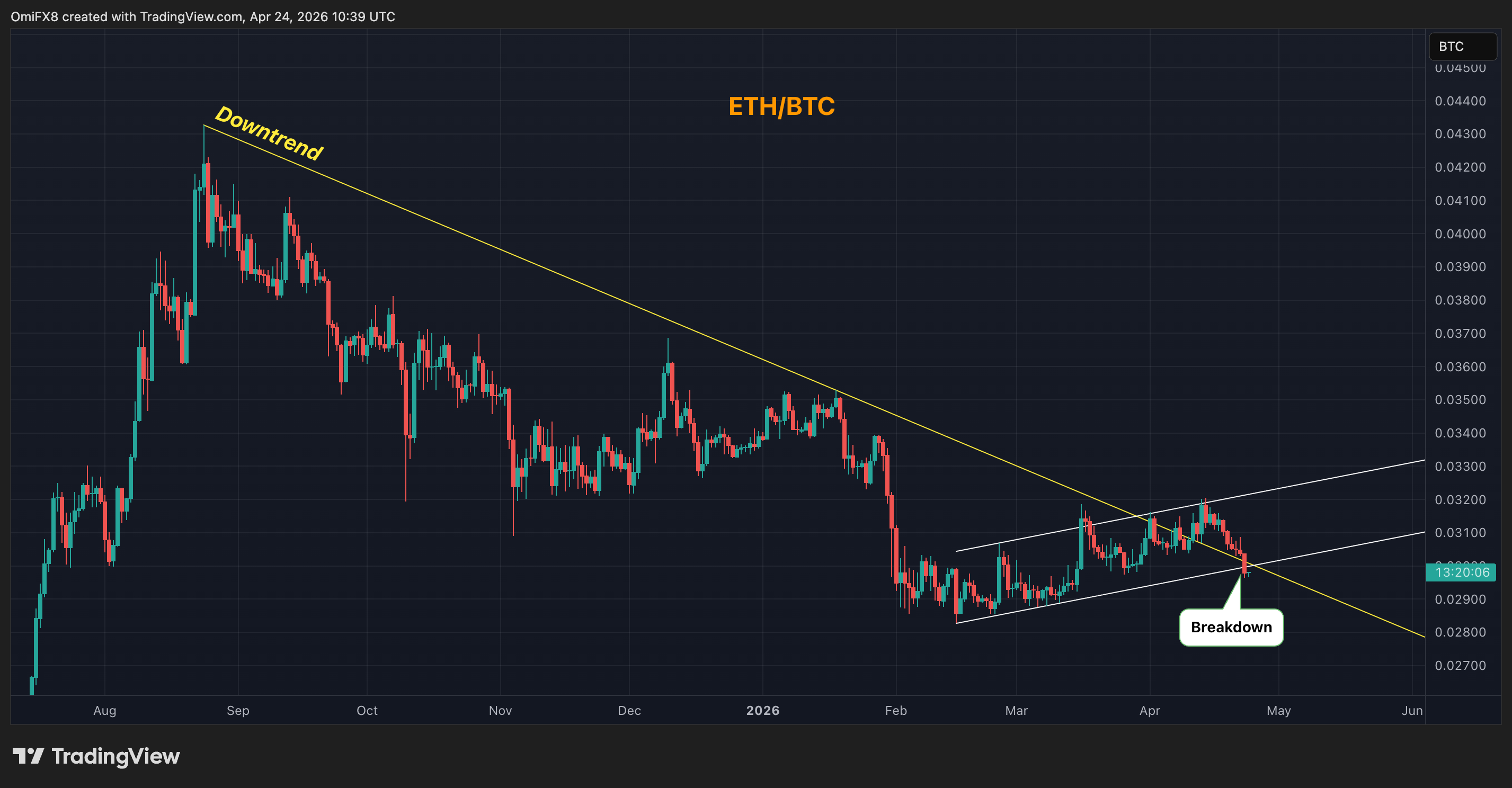 This breakdown augurs a continuation of bearish momentum and raises the likelihood of further declines or extended periods of consolidation within the ETH/BTC pairing, suggesting that ether shall continue to languish in Bitcoin’s formidable shadow as we move onward.
