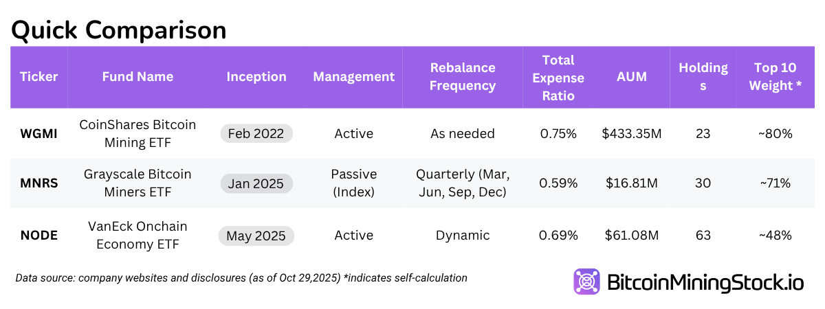 The first Bitcoin mining ETF, WGMI, launched in 2022. Its performance has generally mirrored Bitcoin’s price cycles, amplifying both the upside during rallies and the downside during corrections. As more miners went public and institutional interest grew, Grayscale also launched its own mining ETF, MNRS, in early 2025. A few months later, VanEck’s digital assets team launched NODE. While NODE isn’t exclusively a mining ETF, a large portion of its holdings are mining-related companies, making it relevant for inclusion in the current report. 🧠