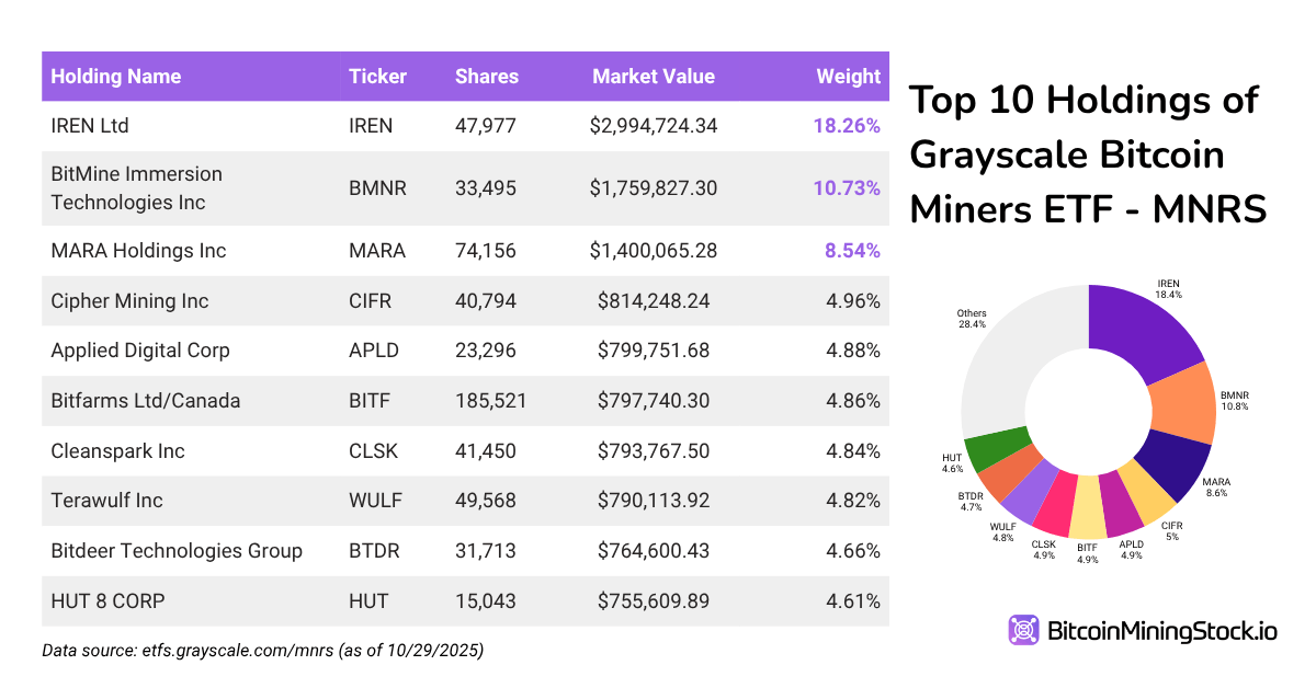 Launched in January 2025, the Grayscale Bitcoin Miners ETF (MNRS) offers passive exposure to the Bitcoin miners and the Bitcoin mining ecosystem by tracking the Bitcoin Miners Index. The index applies quantitative screens to select constituents, with criteria based on pure-play (≥50% revenue from mining), market capitalization (≥$50 million), and liquidity. 📈