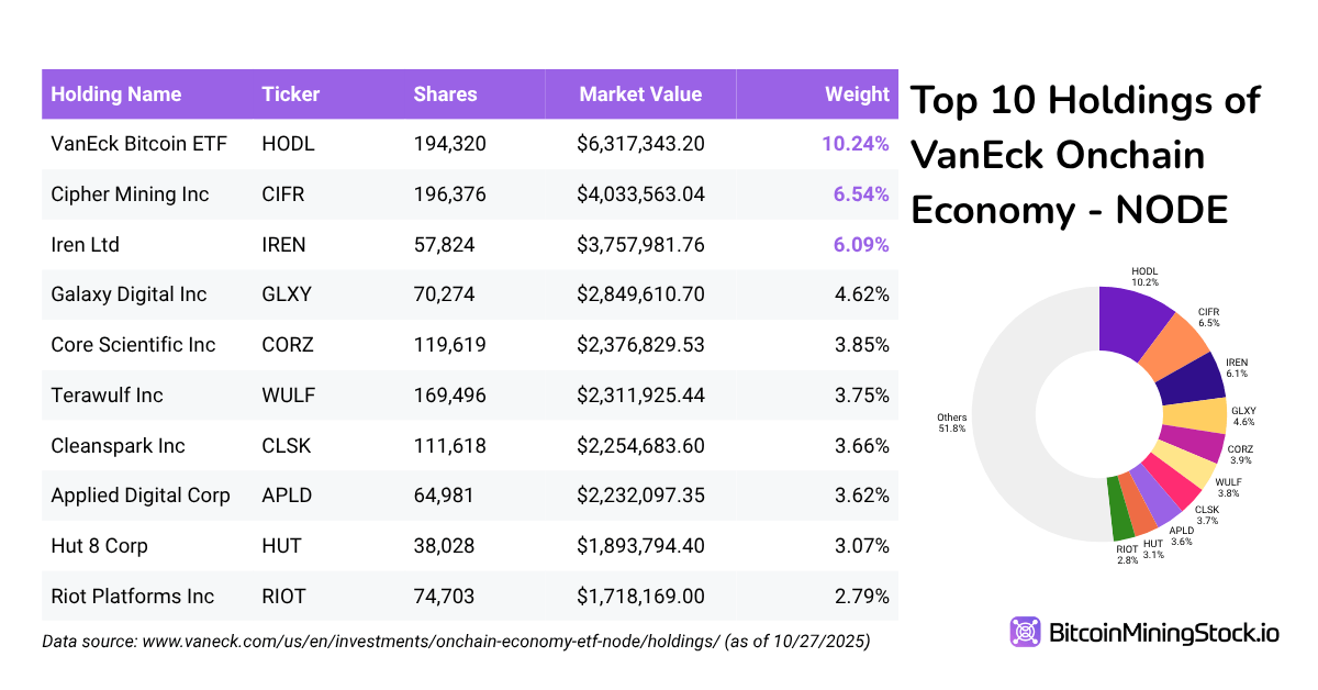 Launched in May 2025, the VanEck Onchain Economy ETF (NODE) is actively managed and takes a broader approach than its peers. While not explicitly a Bitcoin mining ETF, 80% of NODE’s top 10 holdings are public Bitcoin miners, making it a meaningful proxy for sector exposure within a diversified crypto equity portfolio. 📈
