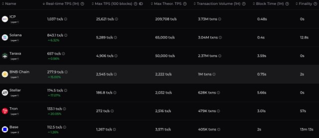 In comparison, Solana handles 843 TPS in real-time with a 0.4-second block time and 12.8-second finality. BNB Chain moves 278 TPS in under a second. Even Tron and Base process well above 100 TPS, with block finality under a minute. Bitcoinâs one-hour delay makes it look like dial-up internet next to these fiber-optic chains, much like comparing a horse-drawn carriage to a steam locomotive.