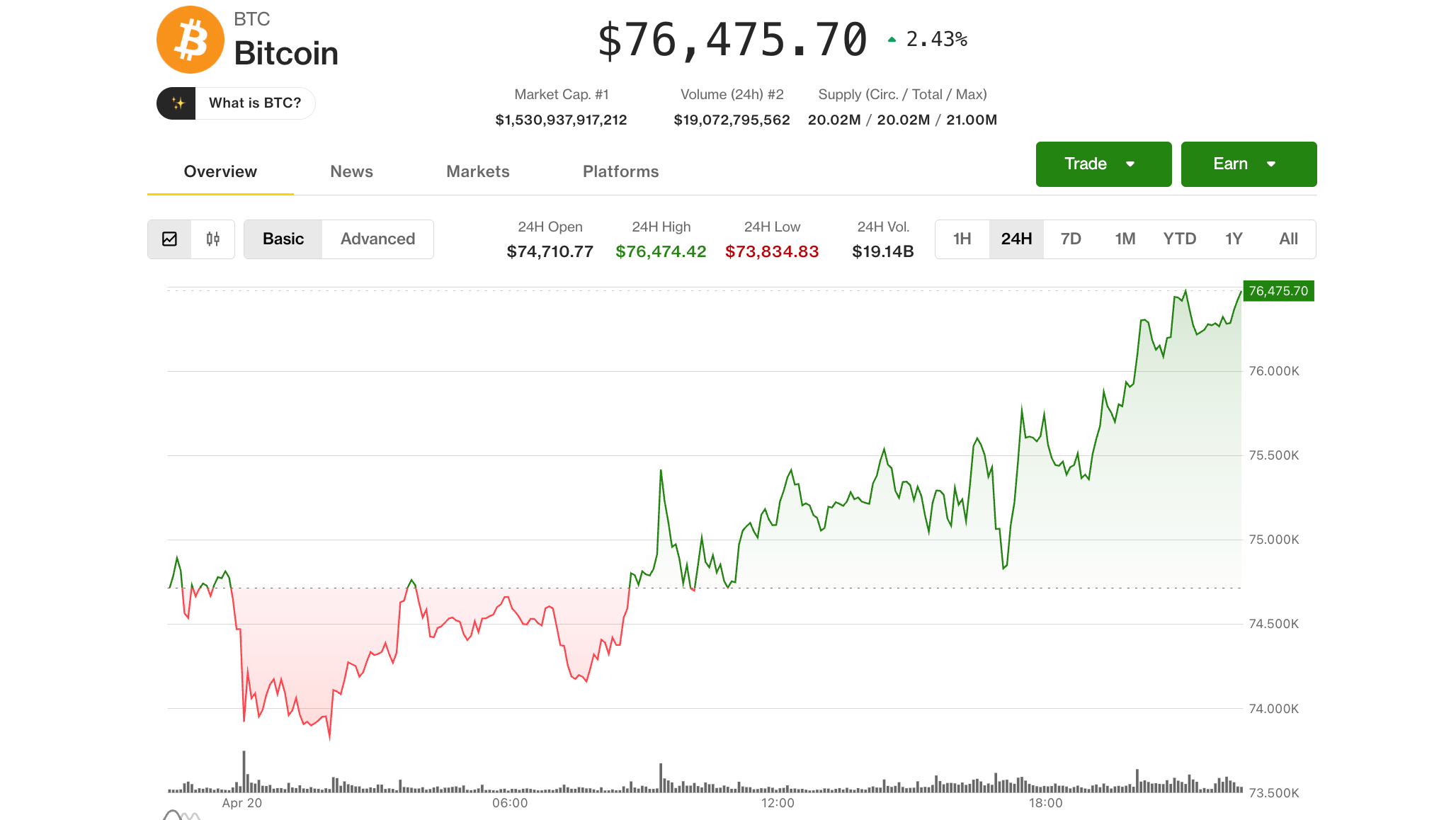 Bitcoin, that incorrigible rogue, held steadfast above $76,000 on Monday, rebounding from its overnight lows as the broader crypto market maintained a semblance of composure, despite the war drums beating in Iran. The largest cryptocurrency climbed a modest 2.4% over the past 24 hours, recovering from a dip below $74,000 earlier in the session. Ether, XRP, Solana, and their ilk followed suit, as the broad-market CoinDesk 20 rose 1.7%.
