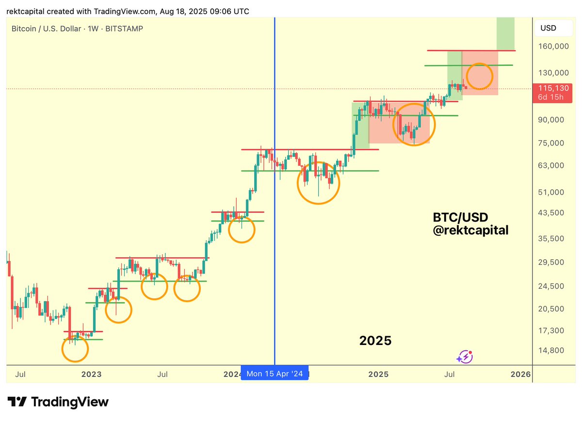“Should Bitcoin dip again,” he adds, “it’ll need to fall below $114,000 first, which is just the warm-up before the fireworks. Shorter, shallower pulls-because who likes a long, boring dip?”