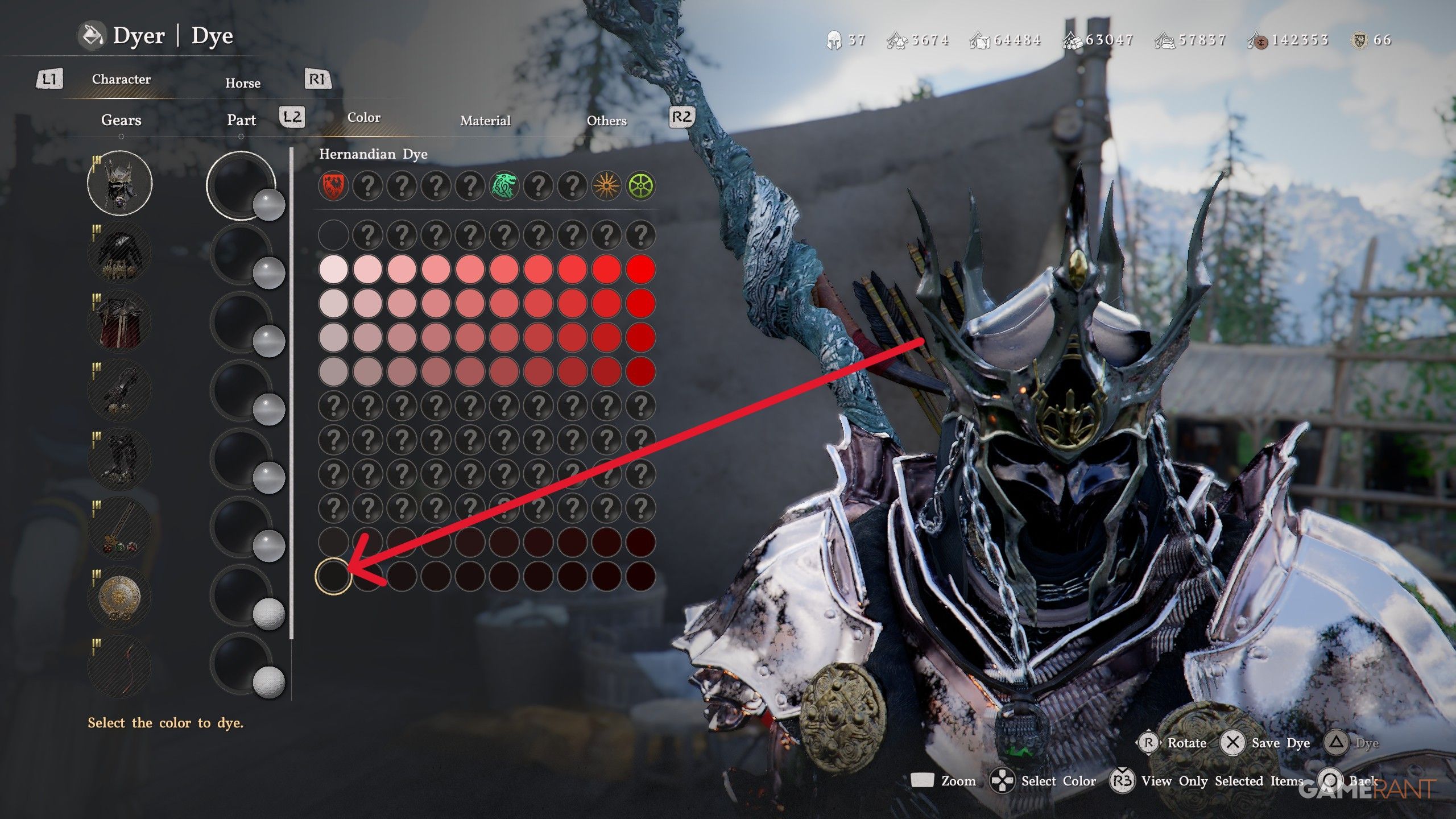 - The Black Dye is located on the bottom left section of the Hernandian Dyes, and you can use it across armors, horse gear, and more.