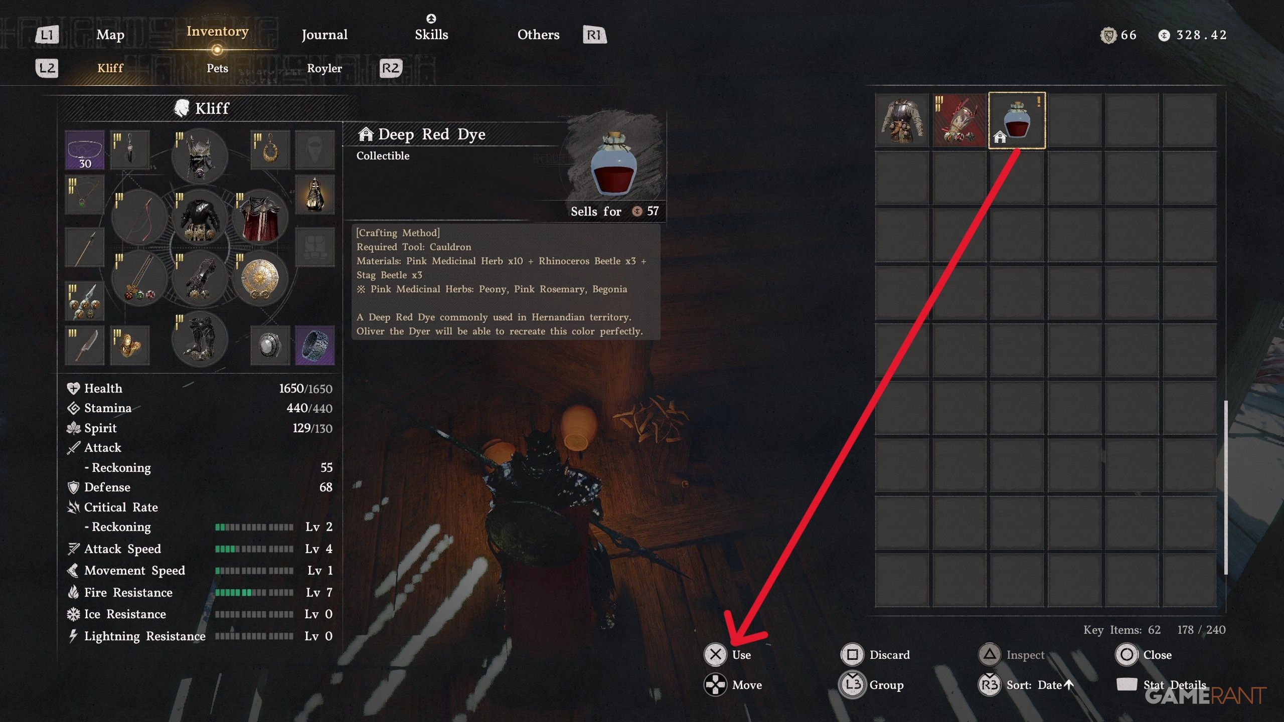 - After picking up the Dee Red Dye, head into your inventory and select “Use” (X/A).