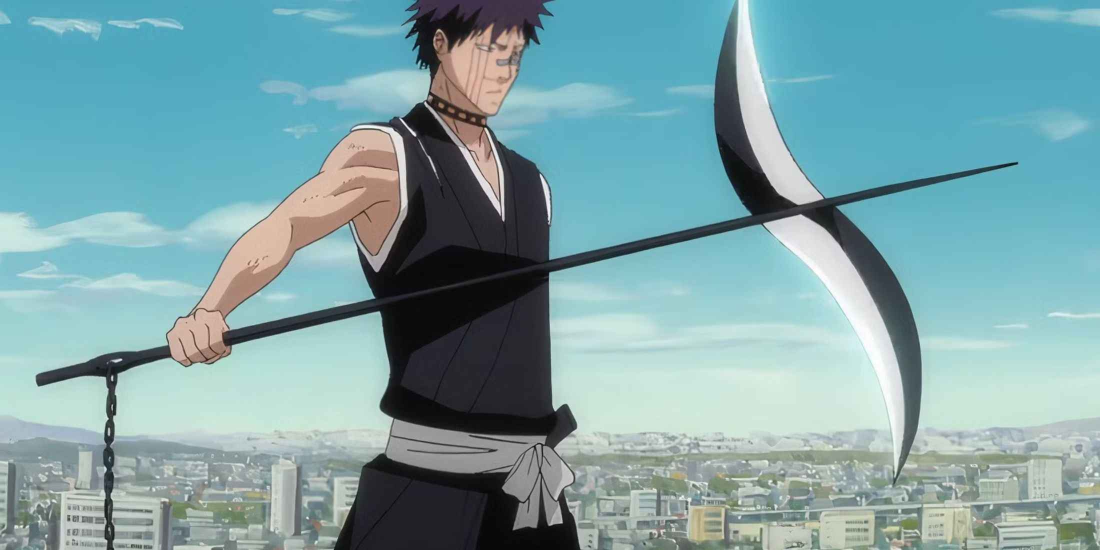 Shuhei Hisagi doesn’t particularly like the appearance of his Zanpakuto, finding it resembles a fearsome weapon meant for collecting souls. However, he’s still become highly skilled in using its special ability, Shikai. When activated, Kazeshini transforms into two scythe-like blades, each with an additional reversed blade. These scythes are linked by a long steel chain, allowing Shuhei to attack from a distance and also to bind or hold back his enemies during a fight.