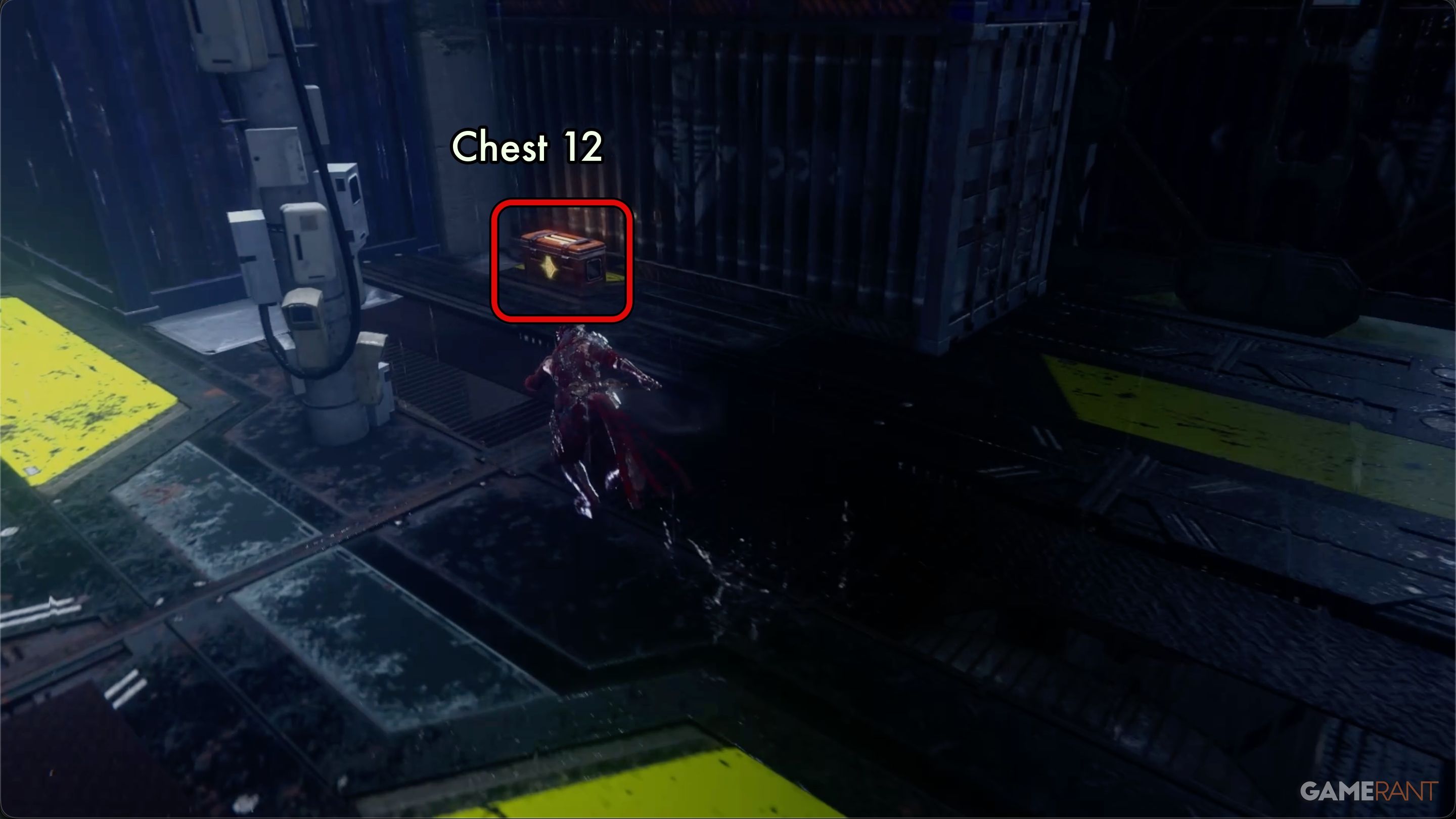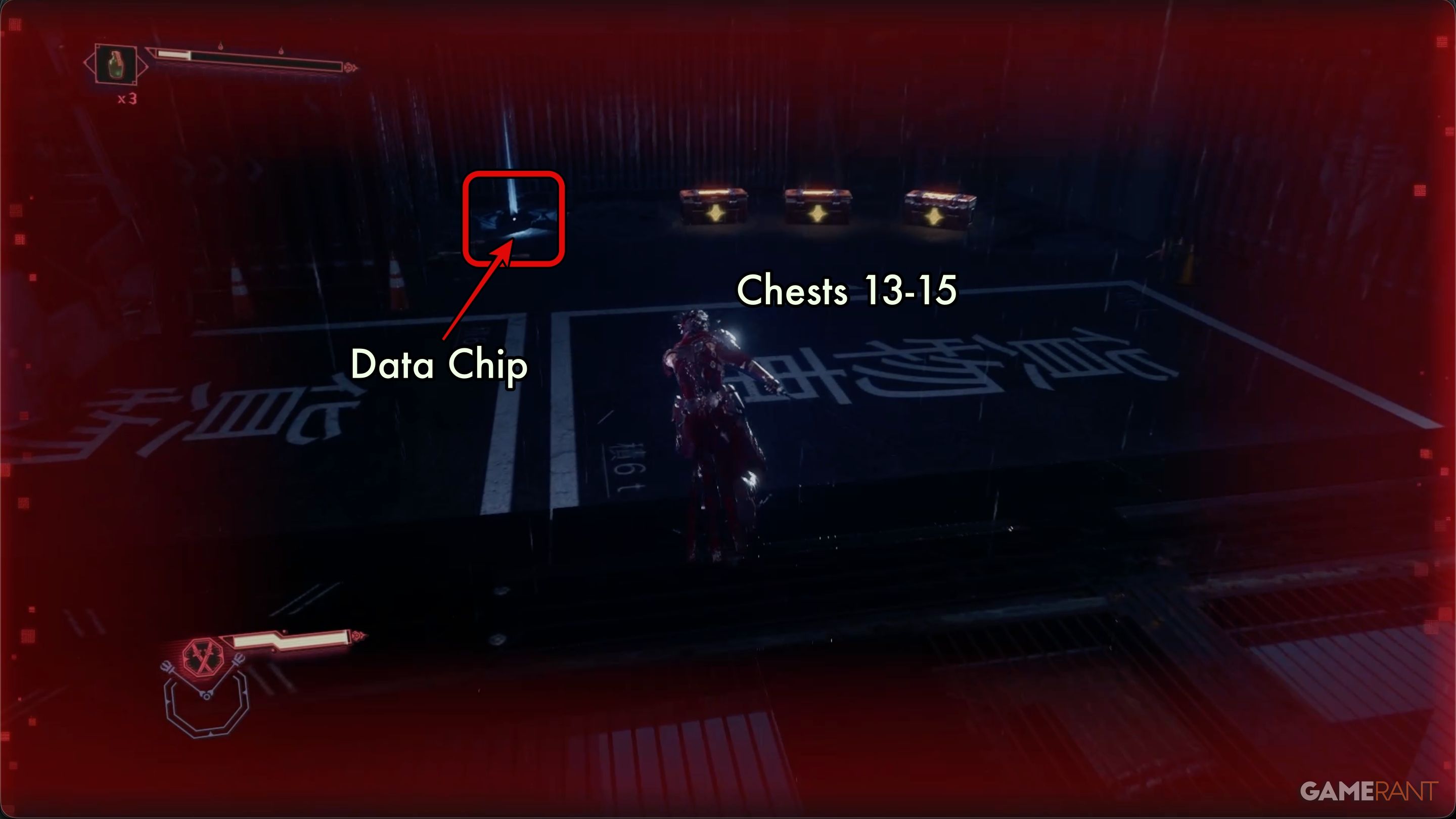 After you clear the courtyard, you’ll find Chest 12 leaning against a wall. Chests 13 through 15 are lined up in a small area created by some containers. The Data Chip is on the ground to the left of these three chests.