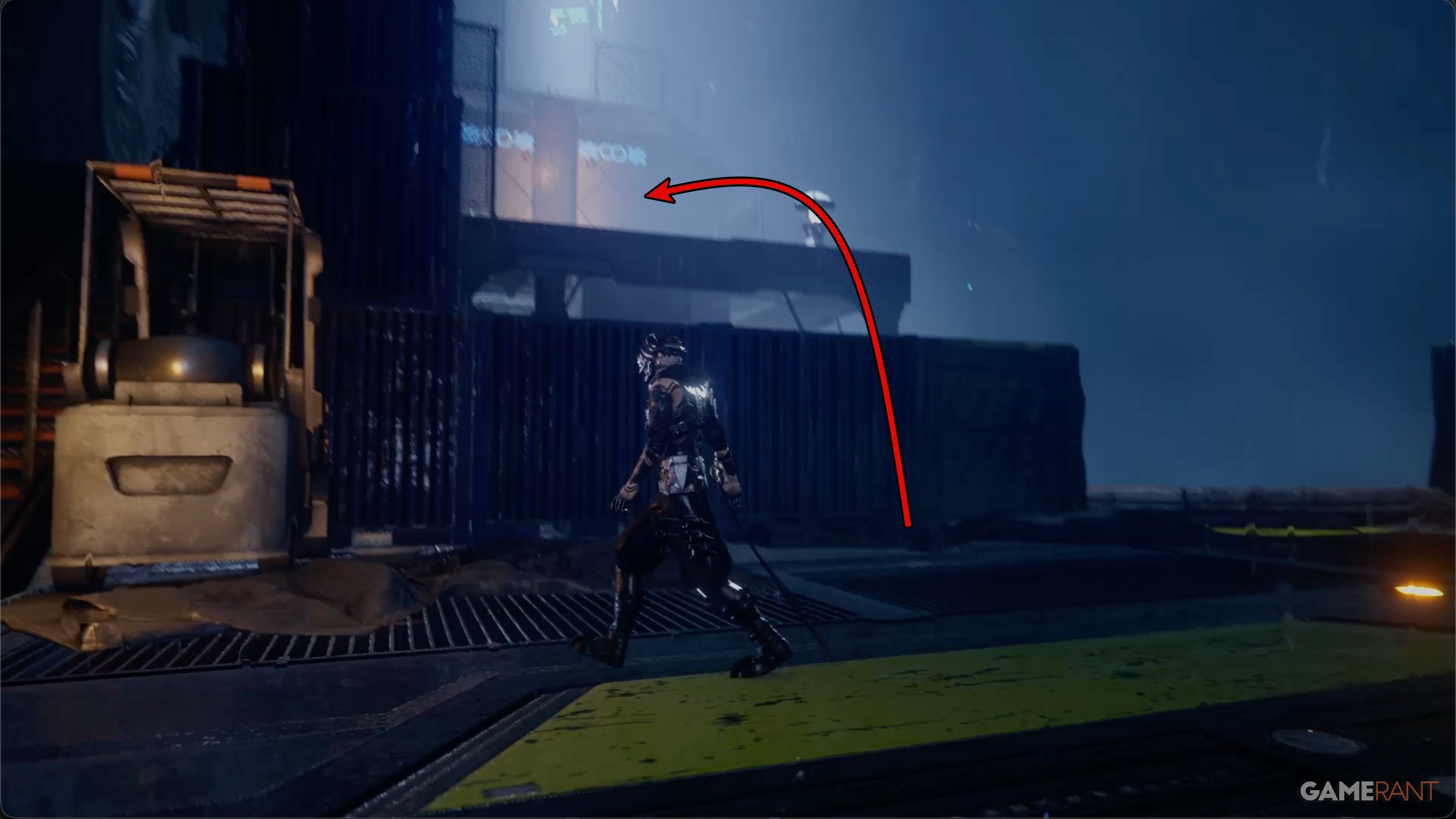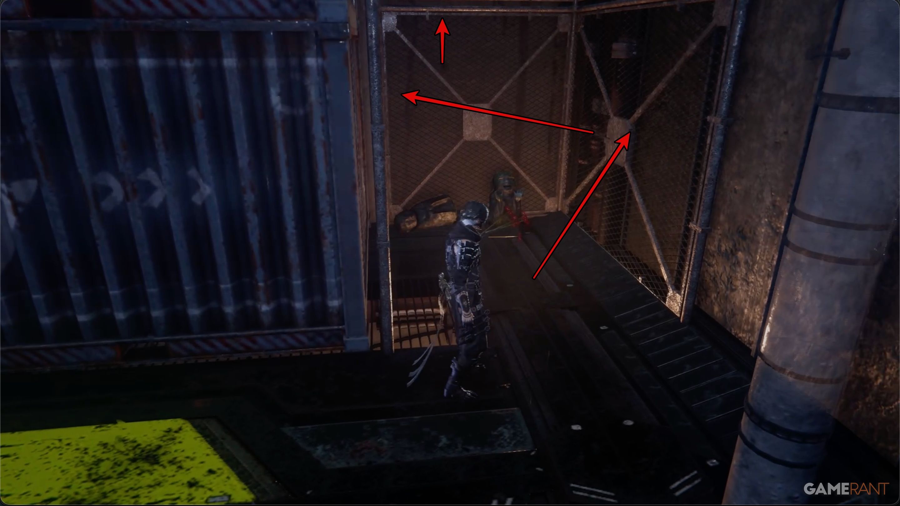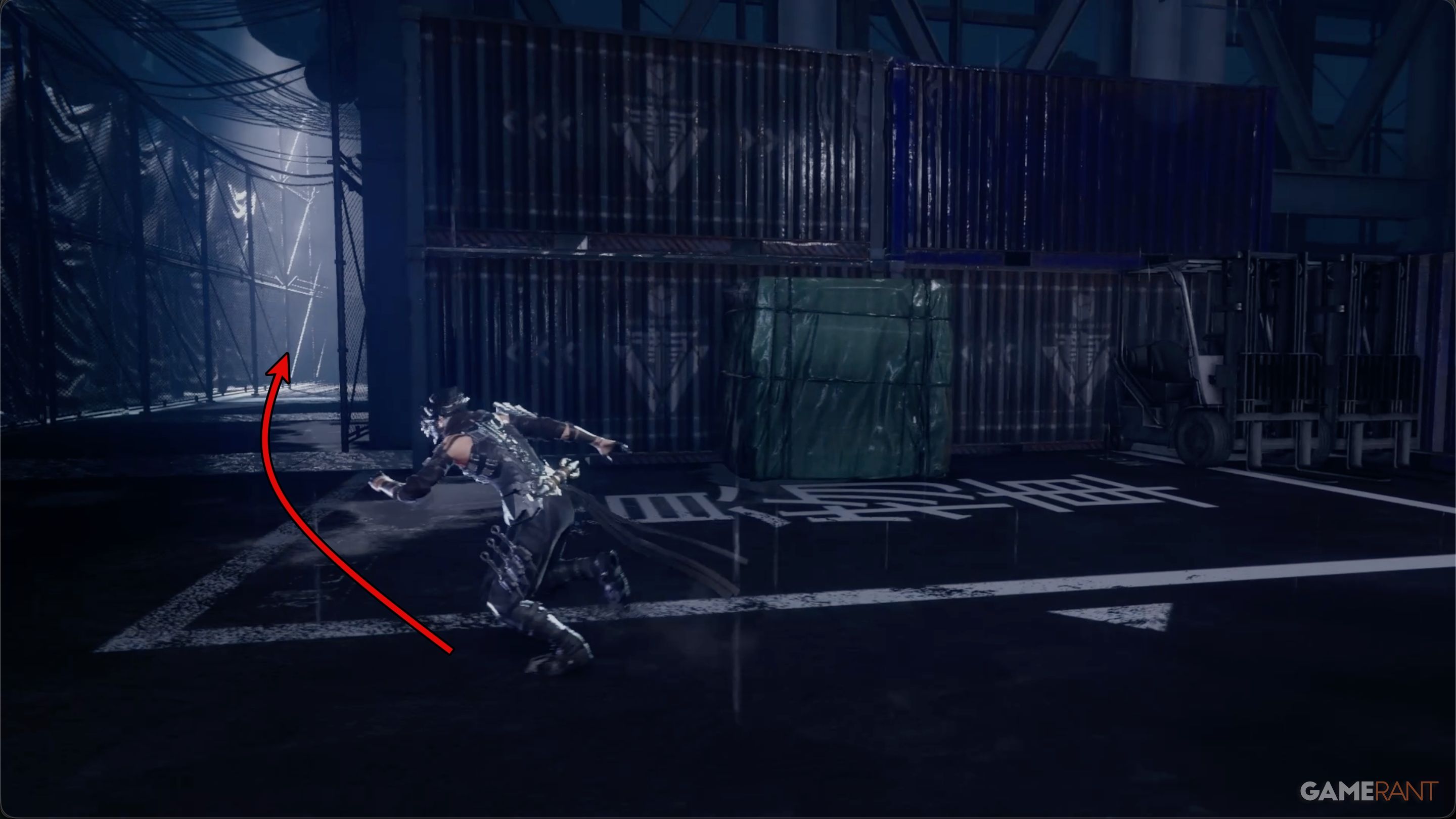 After collecting the chip, make your way over the container and up onto the well-lit platform.
