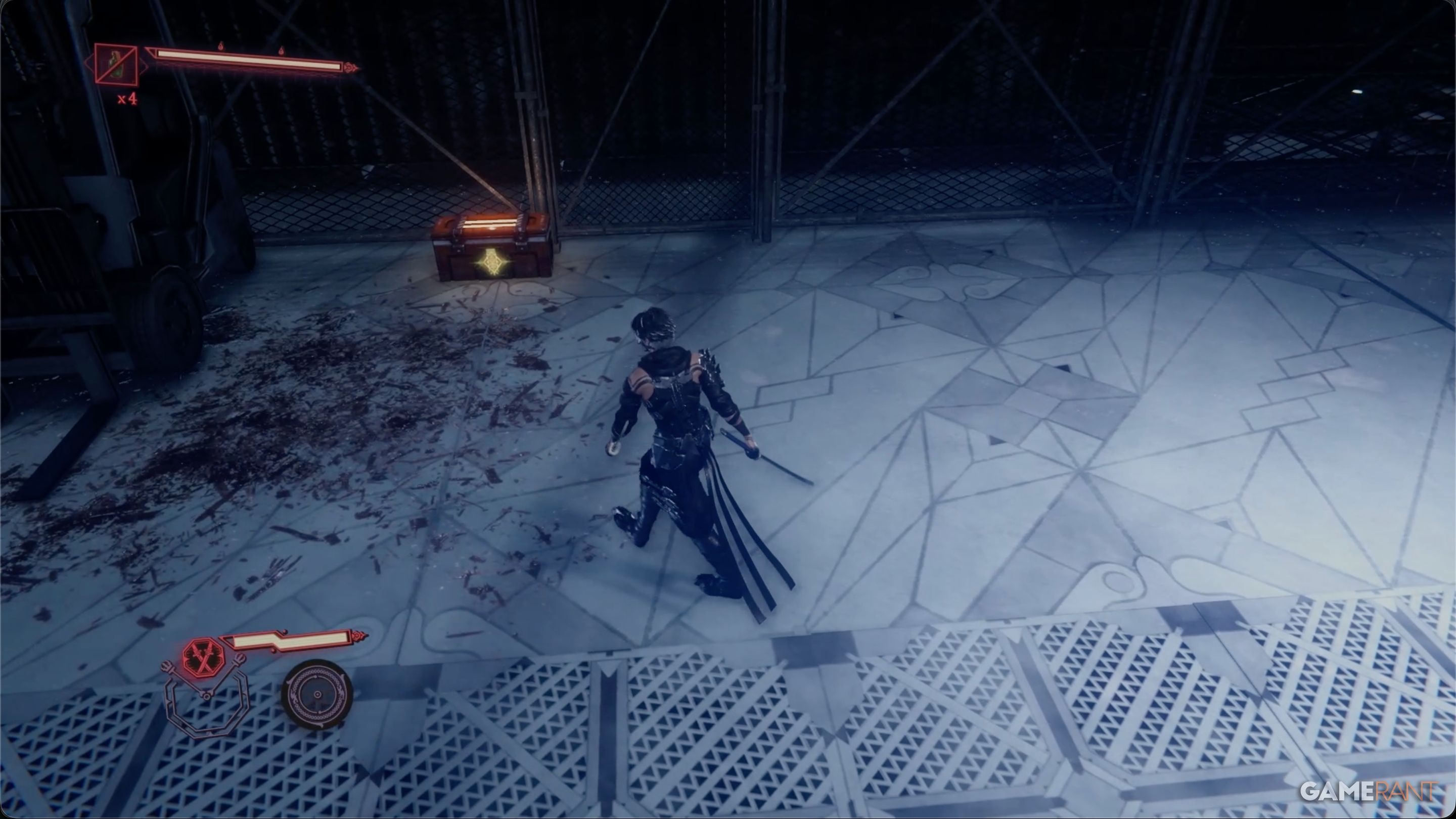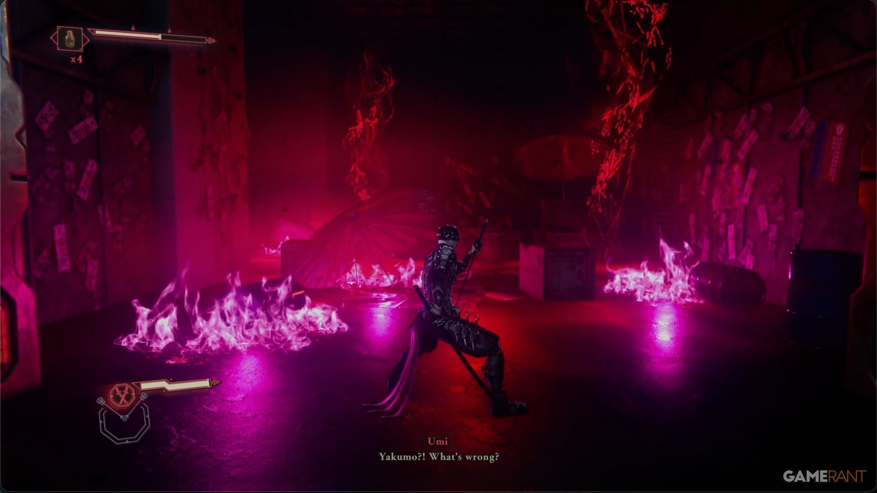 Once you’ve gathered all the chests, you’ll enter a courtyard filled with enemies. Landing there triggers a new feature called the Berserk State. This powerful mode lets Yakumo unleash devastating Bloodbath Kills – attacks so strong they can instantly split enemies in two!