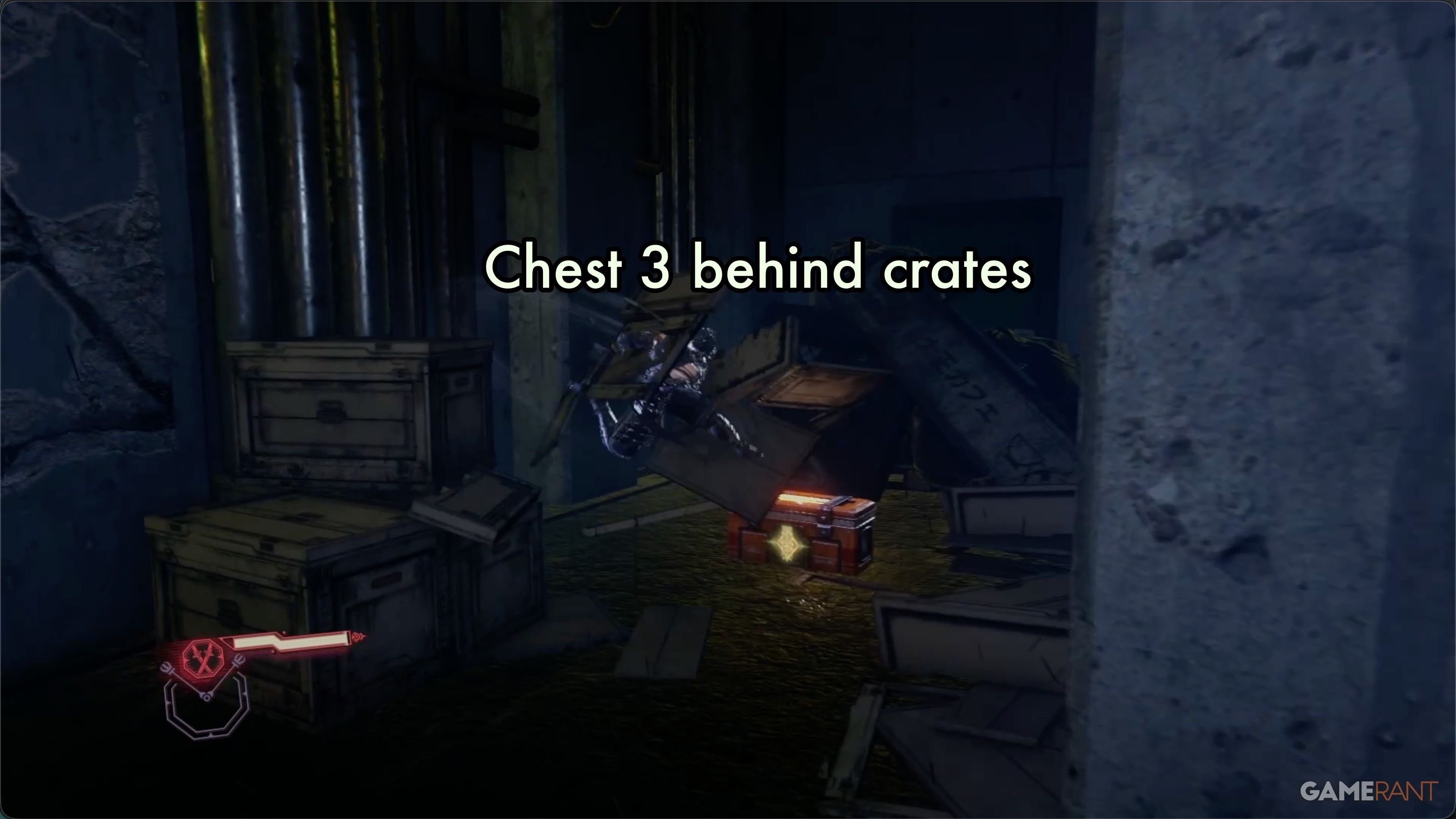 Keep following the main path, which has several sections where you need to run on walls. After the first time you run on two walls in a row, you’ll see a big pile of crates blocking a small area. Break these crates to find Chest 3, which contains one Life Elixir. Shortly after finding the third chest, you’ll come across the first DarkNest Terminal – this is where you access many of the game’s key features, and also where you can find the bonuses included with the Deluxe Edition and Pre-Order versions of Ninja Gaiden 4.