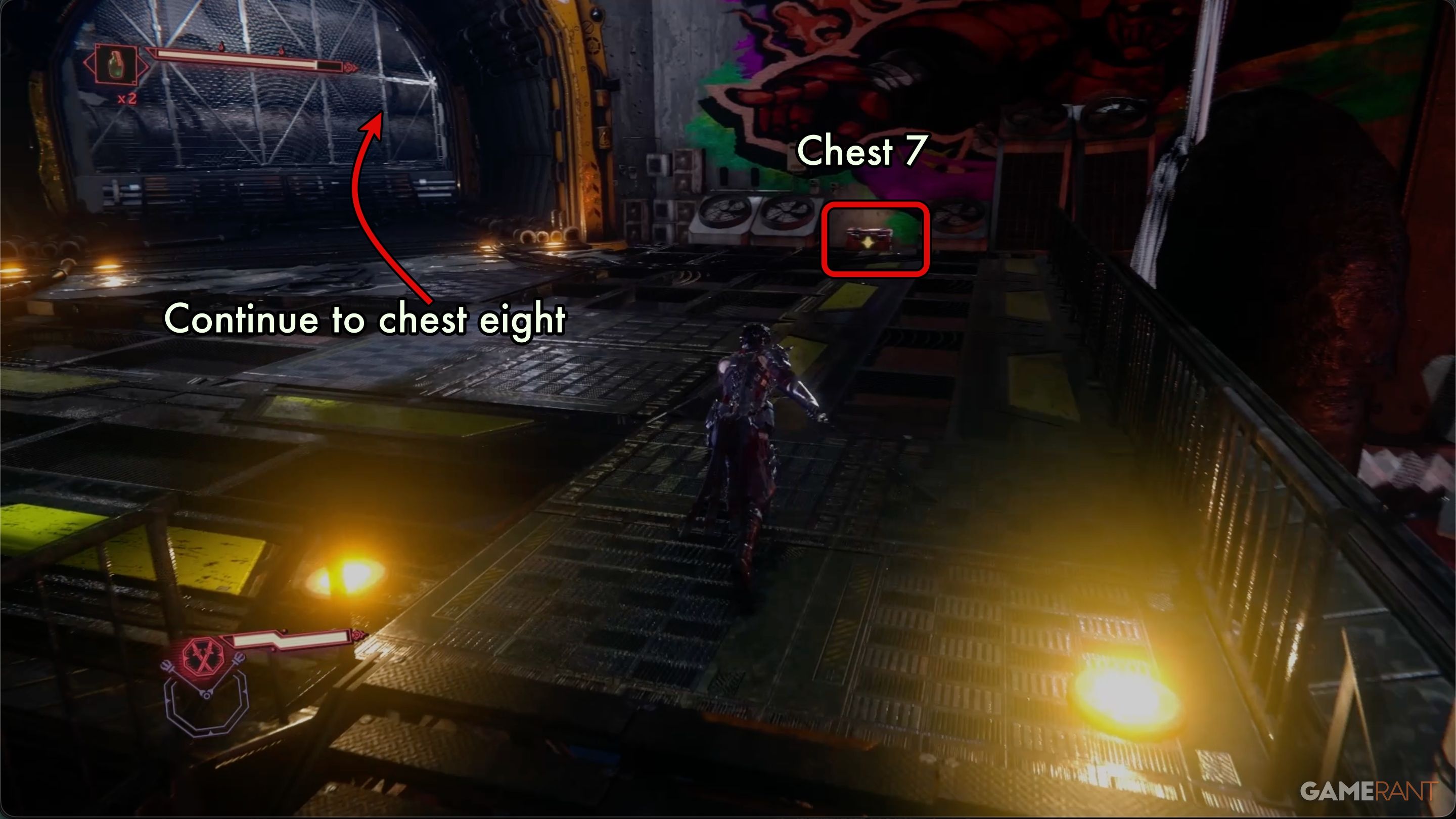 Once you’ve finished talking to Tyran, take the elevator. When you exit, you’ll notice the environment has changed – the hallway will be filled with red flames. As you proceed, be sure to break open the wooden crates; you’ll find Chest 6 hidden behind one near the metal fence.