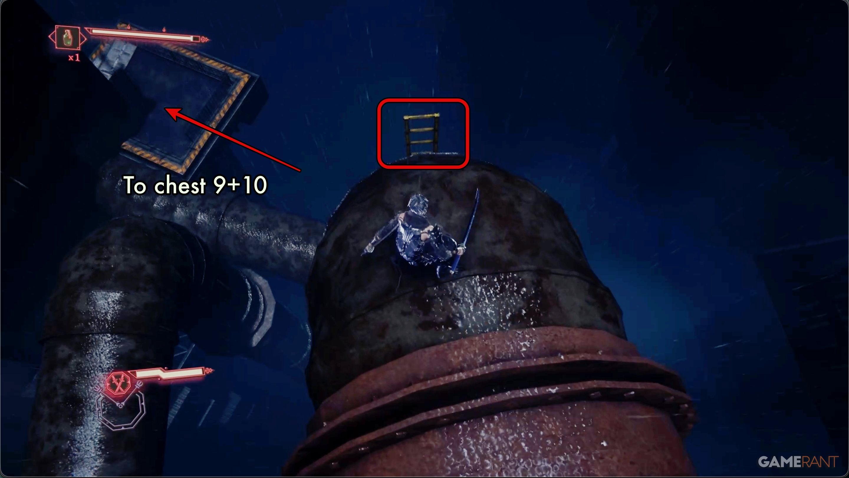 Once you’re past the initial area, you’ll need to jump across a series of large pipes to continue. Look for a curved pipe that seems to lead down into a deep pit – there’s a hidden ladder nearby. Climb down the ladder and turn left to find Chest 9 and Chest 10.