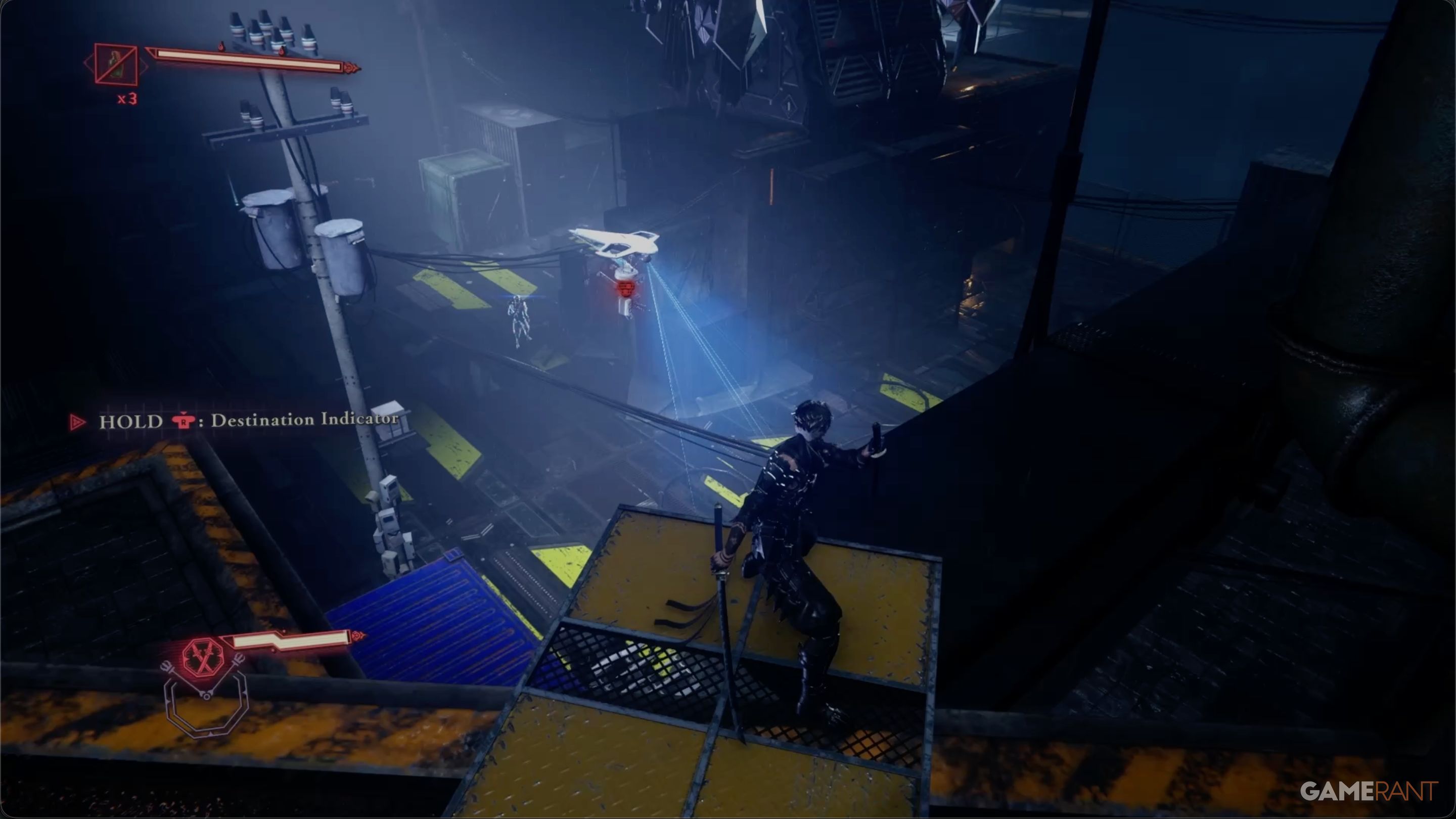 Once you exit the third DarkNest Terminal, you’ll find yourself overlooking an outdoor courtyard. Several enemies are patrolling down below, and a drone is flying above. You can choose to sneakily eliminate some of them, or just jump down and engage in direct combat.