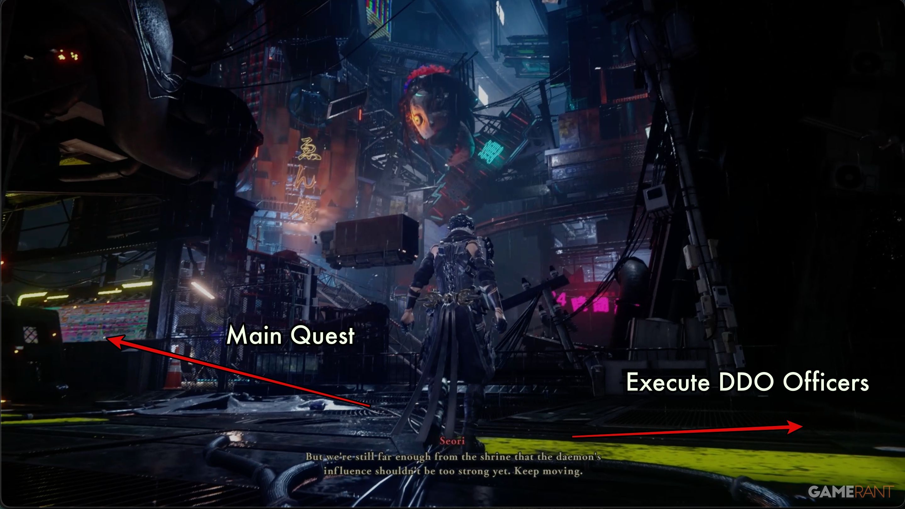 Head down this first hallway, and you’ll enter a bigger space where Seori will tell you about the Shrine Daemon and what happens when you get near it. Looking up at the city, you can go either right or left. If you took the mission to “Execute the D.D.O. Distribution Officers” from the DarkNest Terminal, turning right will start that encounter.