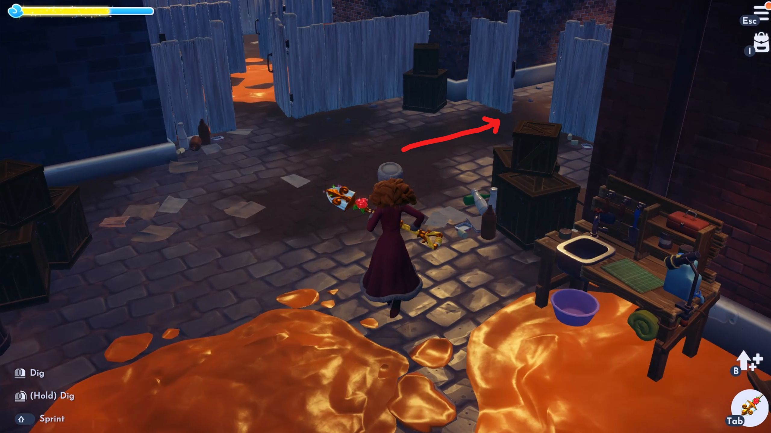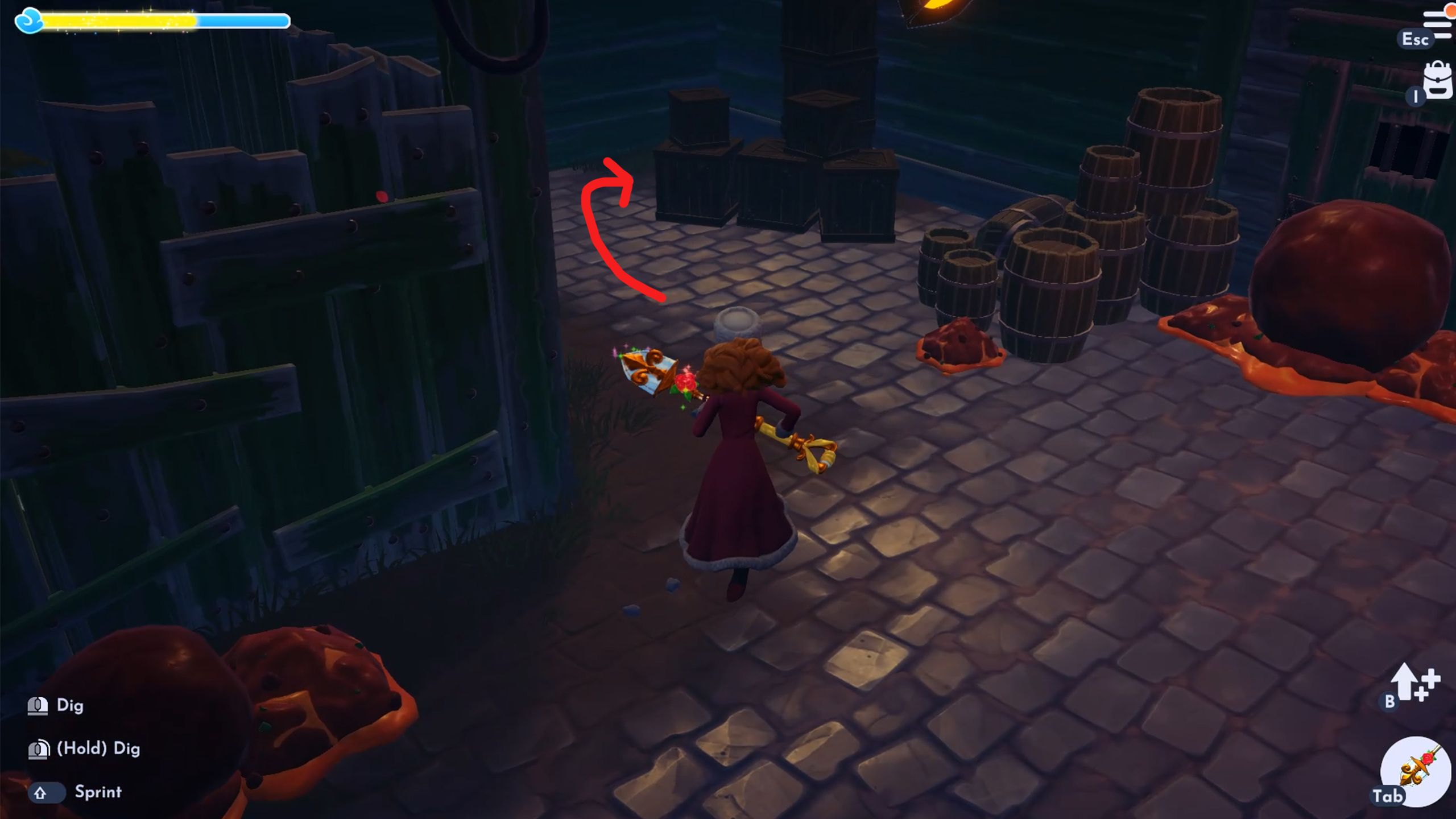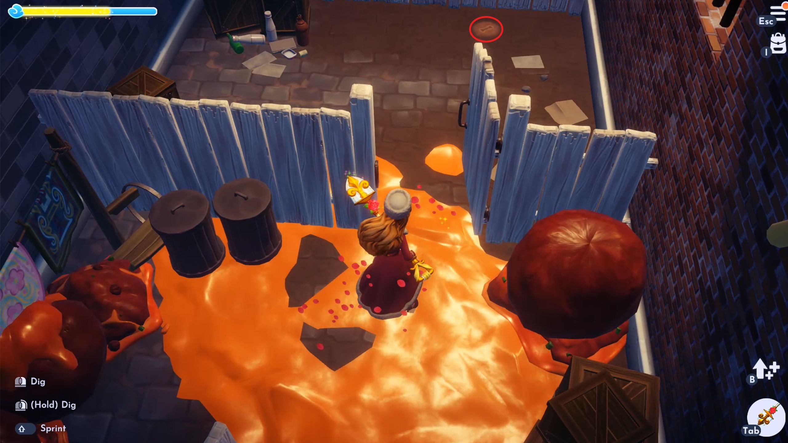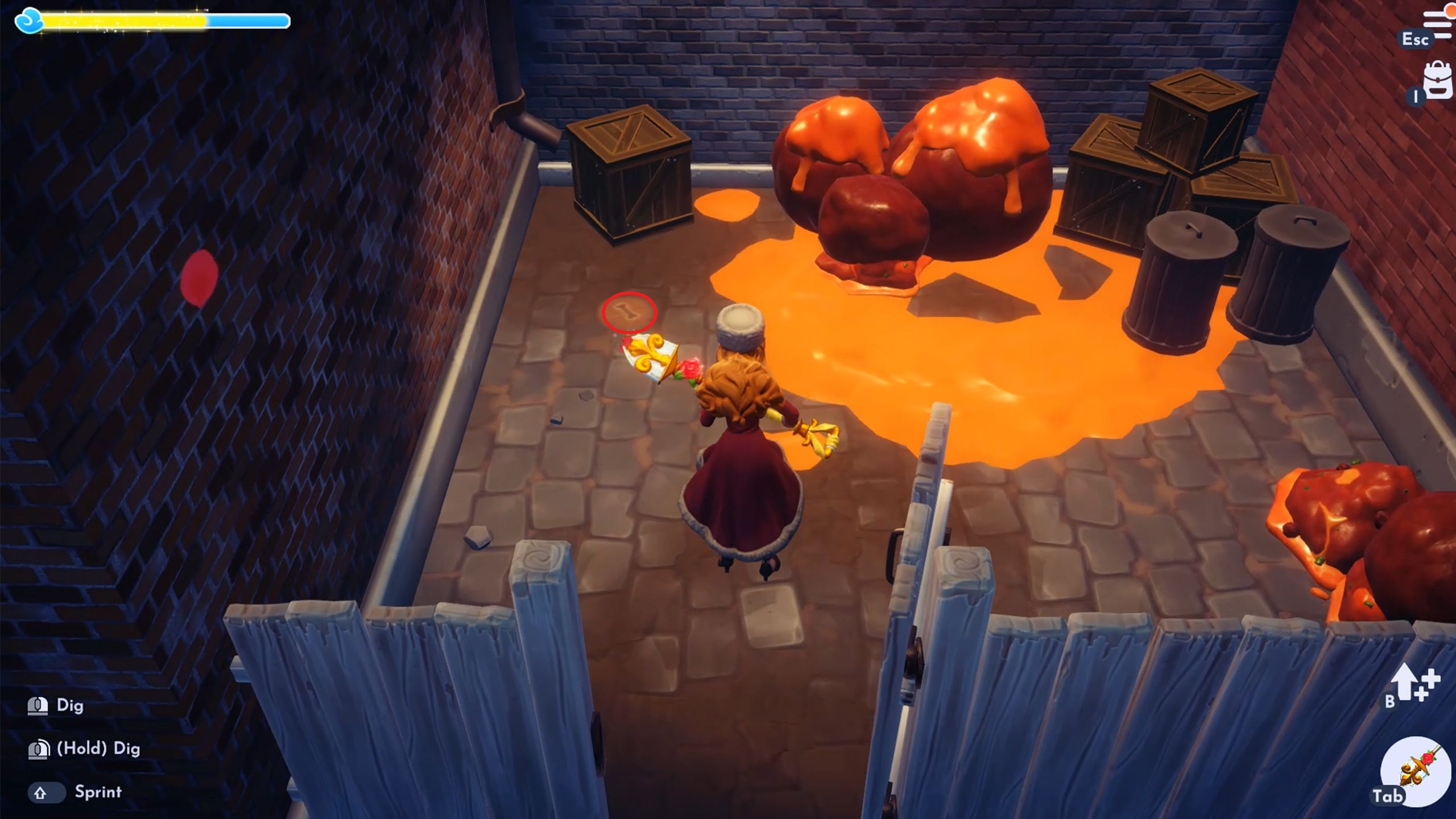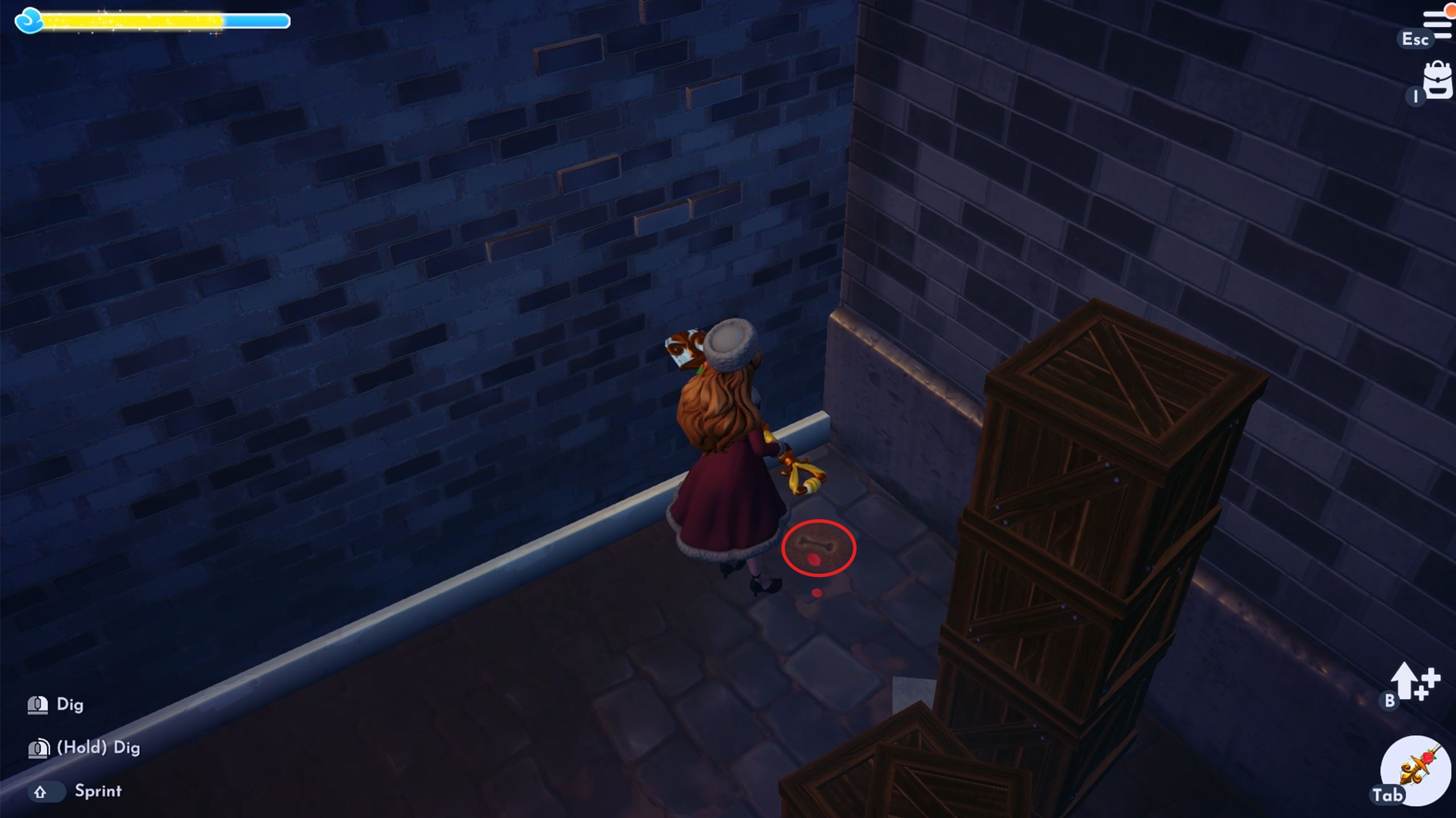 When you enter the Lady and the Tramp area, turn right and look behind the boxes – you’ll find a place to dig for a bone there.