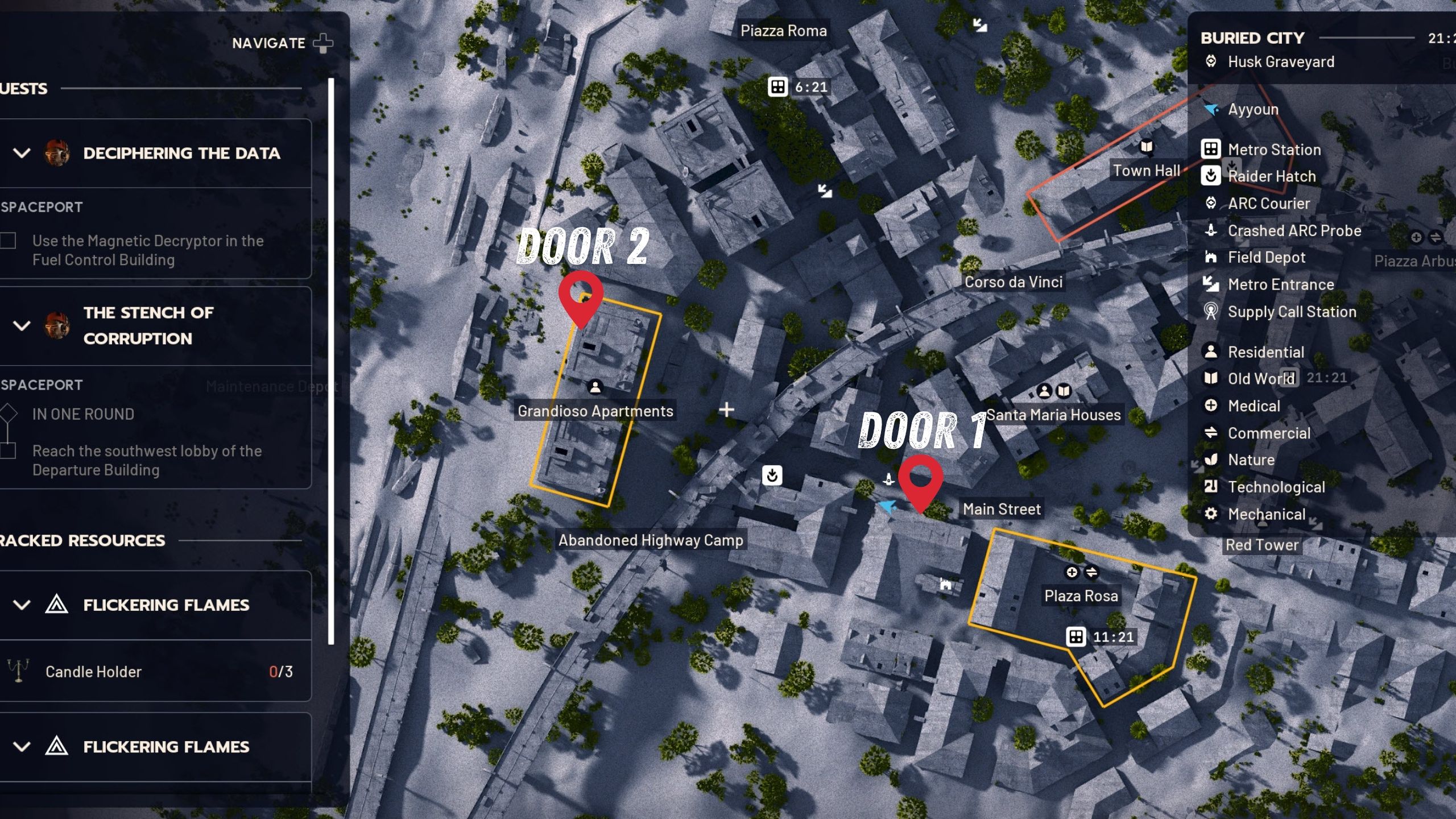 Of the two locations, the locked room in the Grandioso Apartments is the better place to use the Buried City Residential Master Key. To get there, enter the Grandioso Apartments building at the location shown on the map. Take the elevator down to level 02.