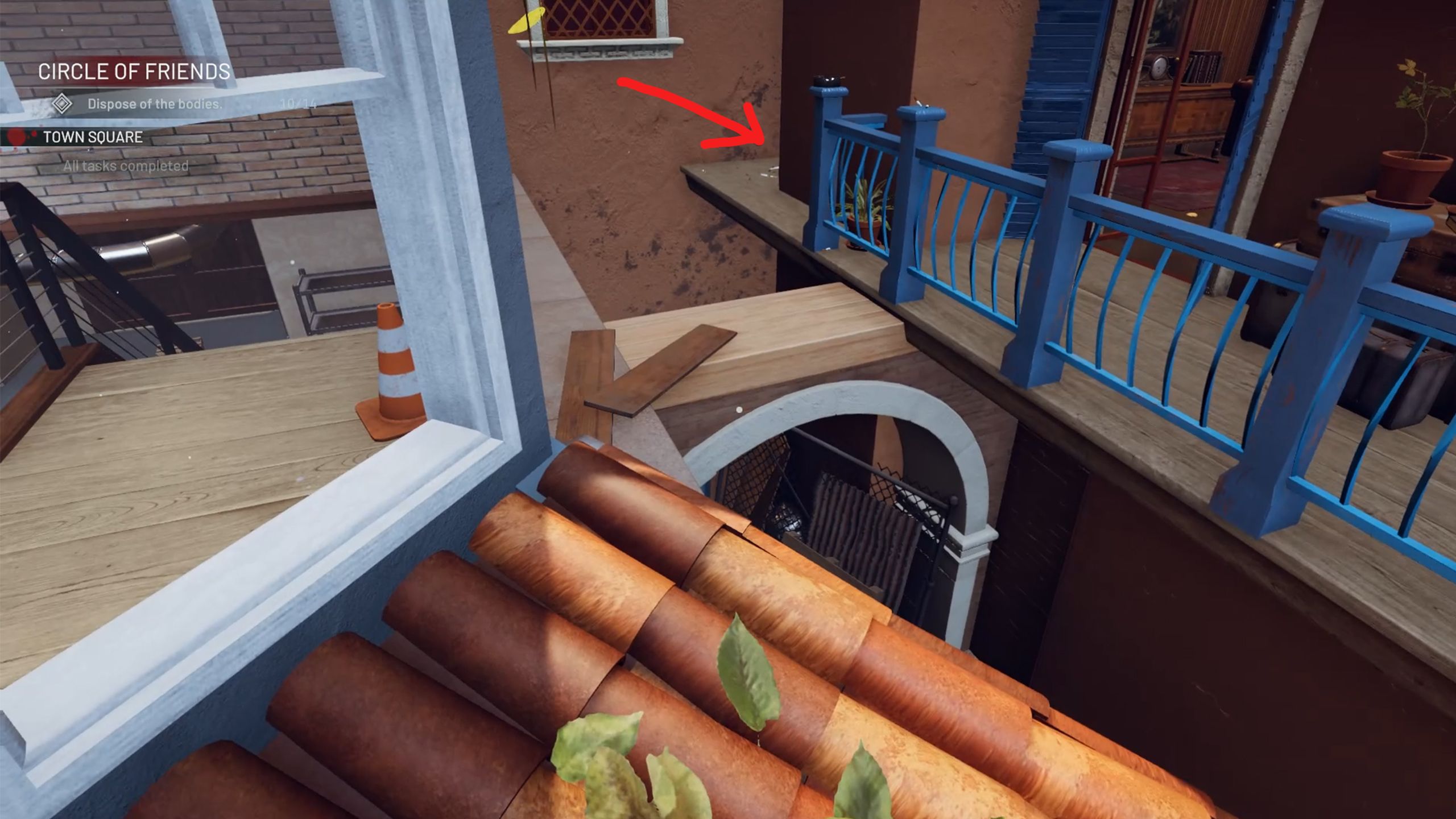 Kovalsky will jump onto a small roof. From there, walk along the edge to the back, where you’ll find a hidden corner. You can either carefully walk around and jump, or hop over the blue railing and climb back up to reach it.