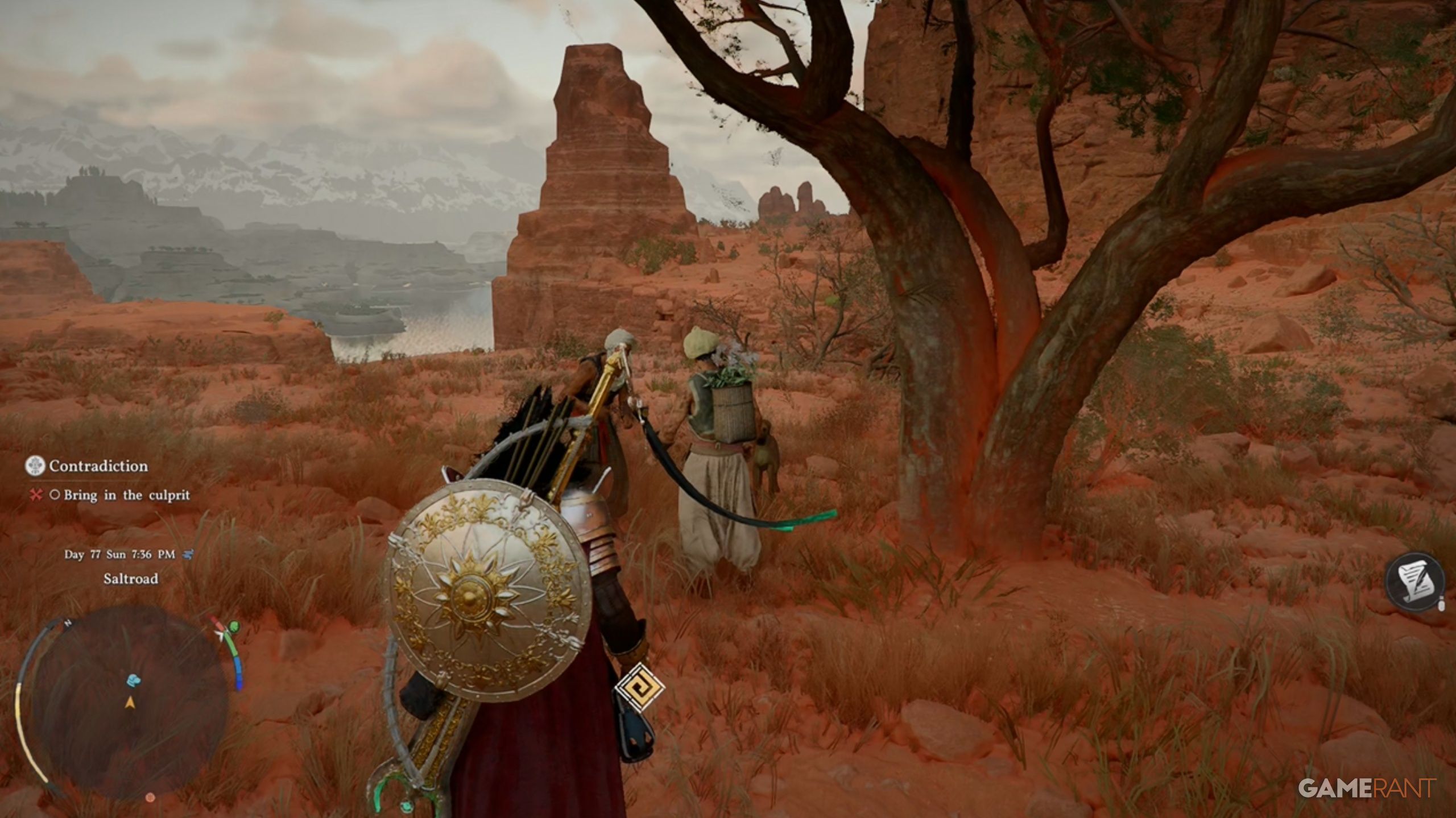 Since you’ve successfully answered all the questions, go north of the Saltroad Trading Post and look for a desert tree. Examining it will show you that Armin is the one responsible. After you’ve identified Armin, bring him back to the Guard Captain to finish the quest.