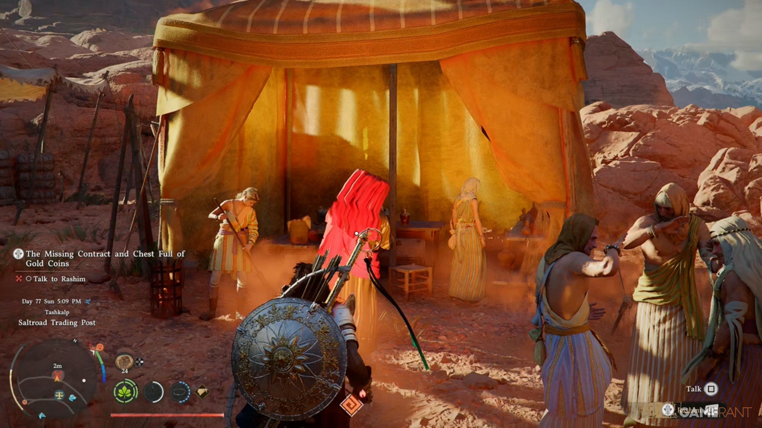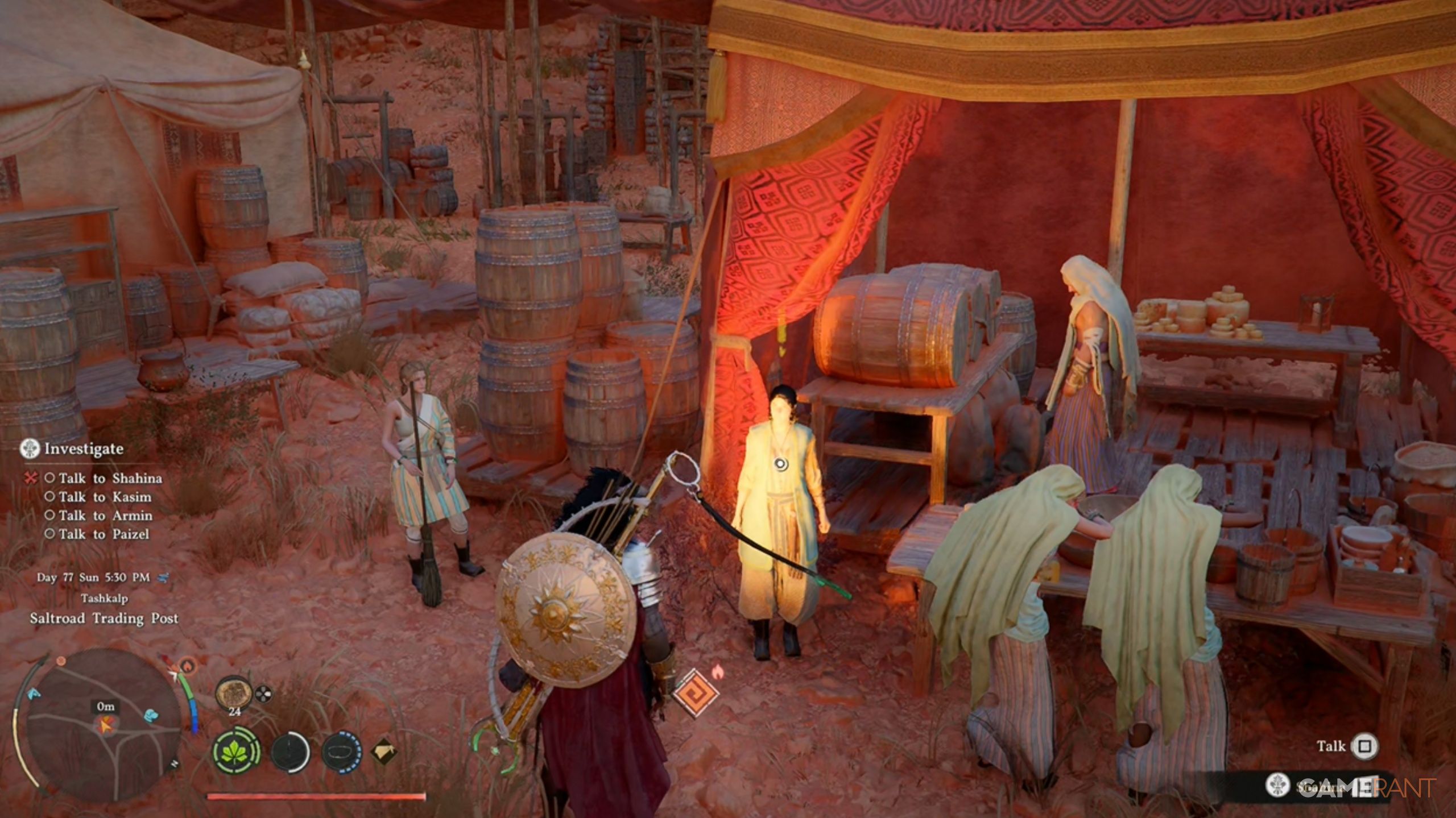 - Shahina is found in front of a red tent in the Saltroad Trading Post.