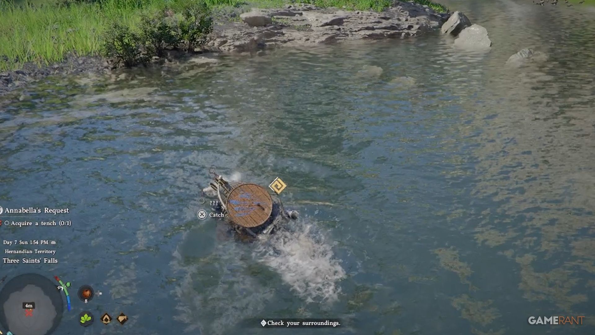 If you’re still following the quest, open your map. You’ll see a new red X on a lake north of Annabella’s shack. The lake where you’ll find Tench is located under a bridge, and you can see exactly where it is in the picture above.