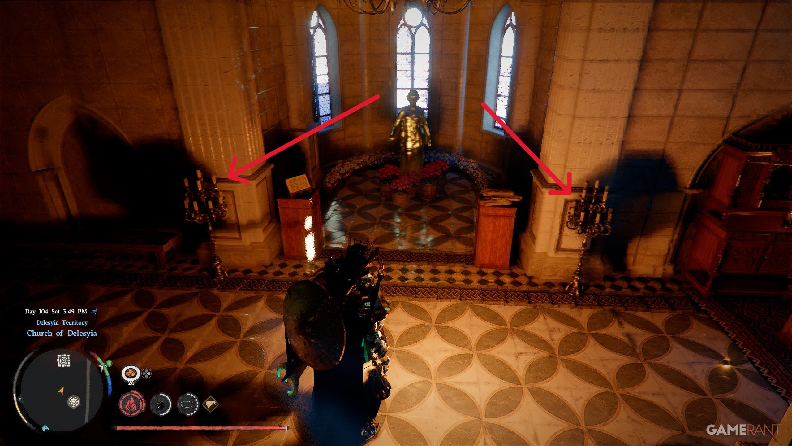 - When you enter the church, you’ll see two unlit candles on the left and right of a golden statue.