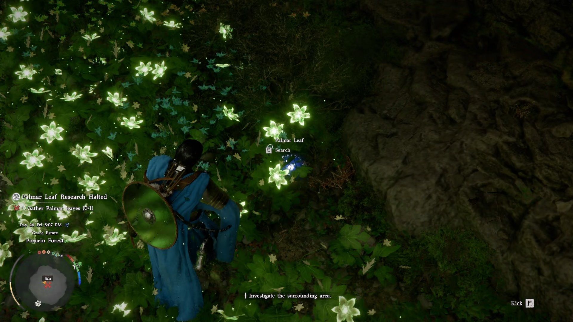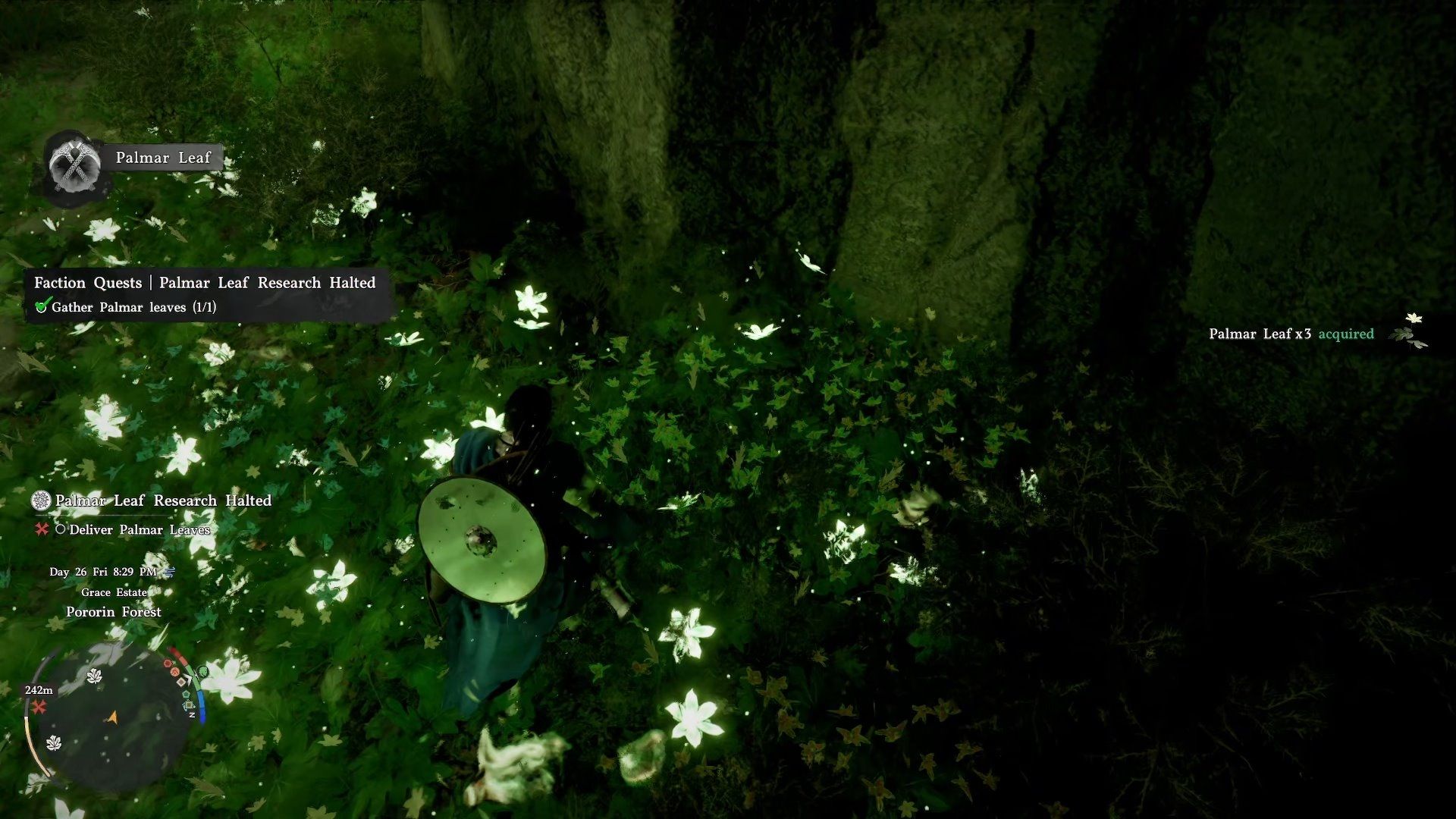 Continue following the quest marker; it will guide you to a large tree tucked away in the village. Underneath the tree, you’ll find patches of glowing green leaves called Palmer Leaves. Search through these leaves carefully to find a Palmer Leaf, but keep in mind they don’t always appear, so you might need to check several times.