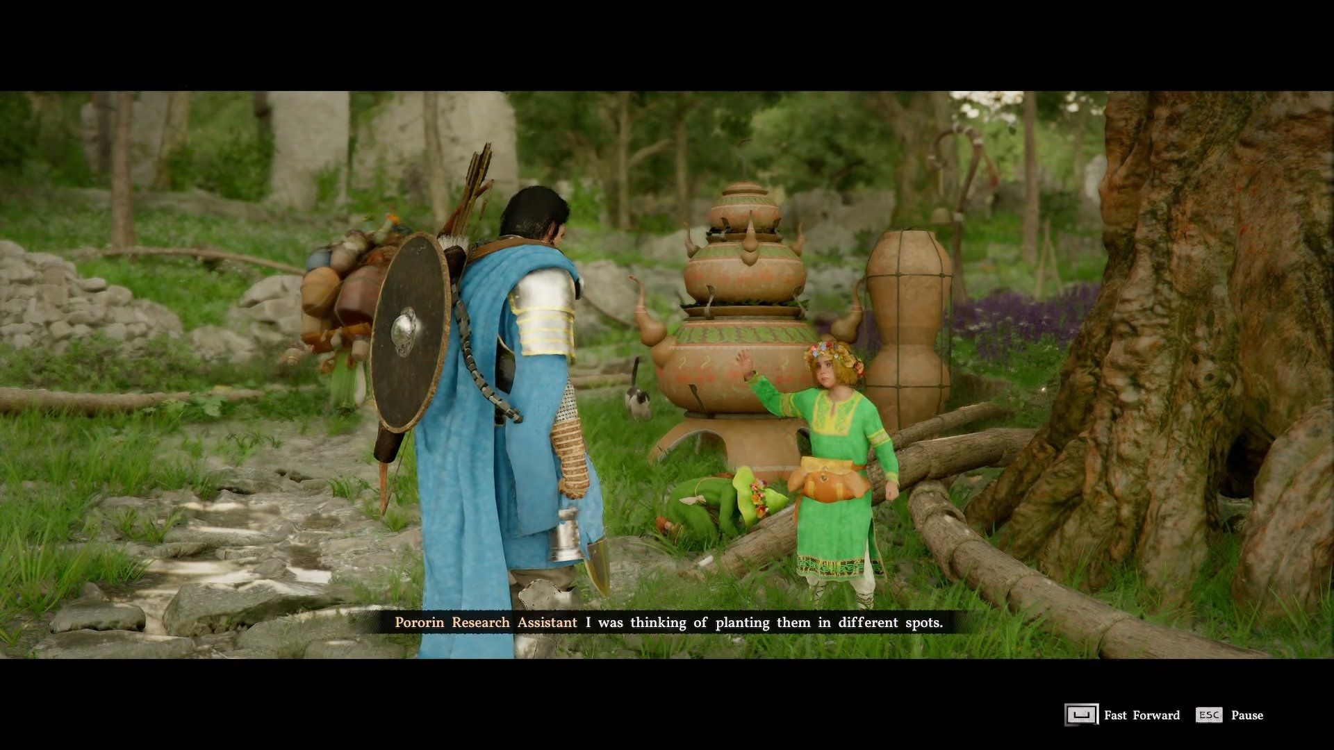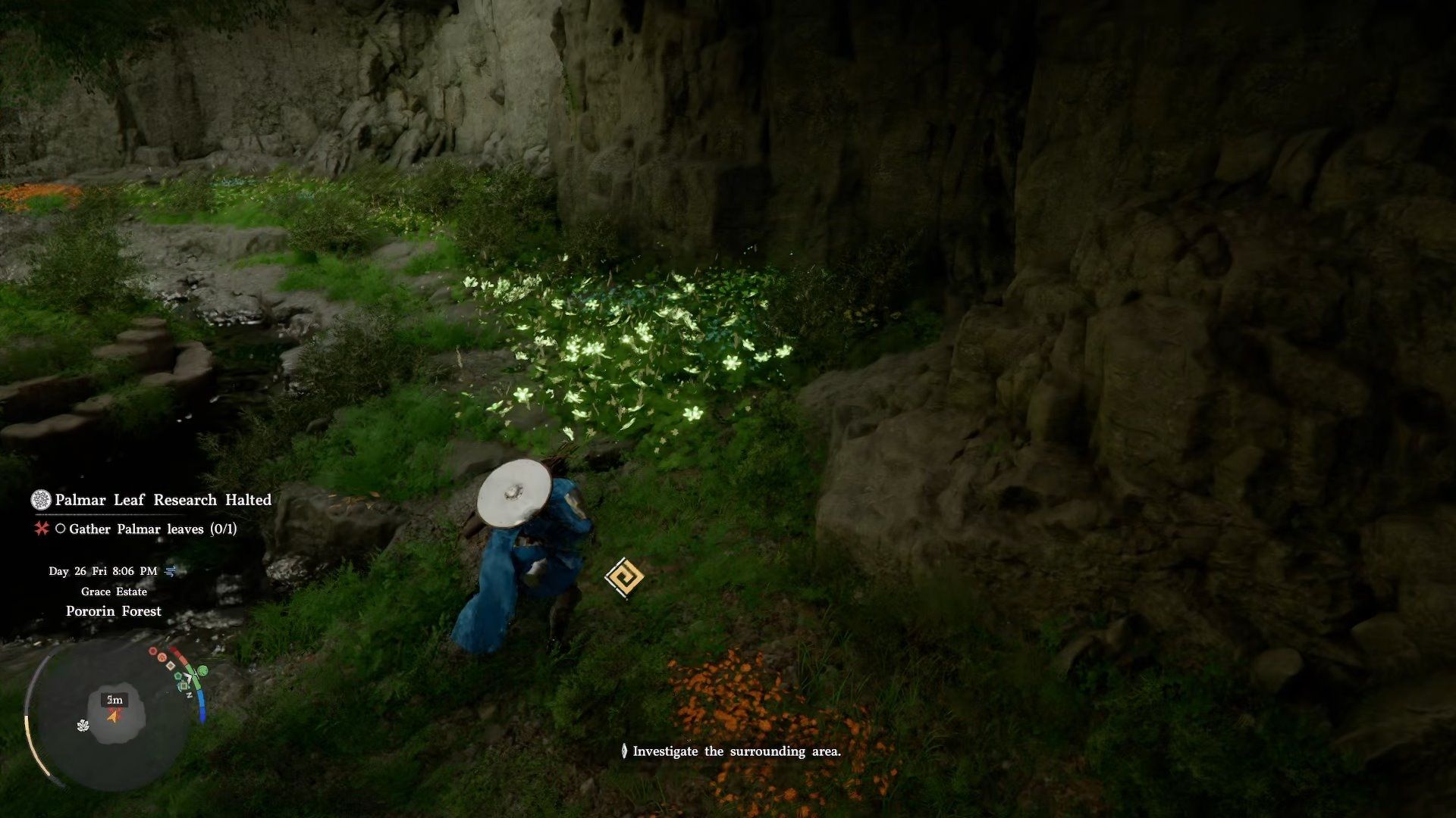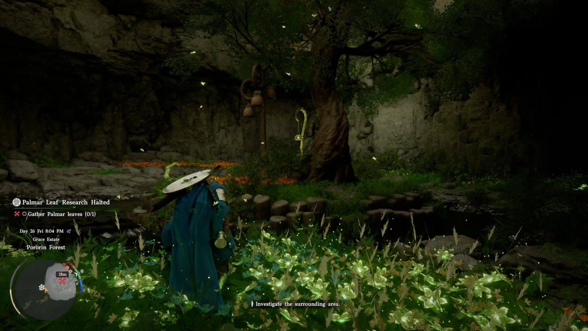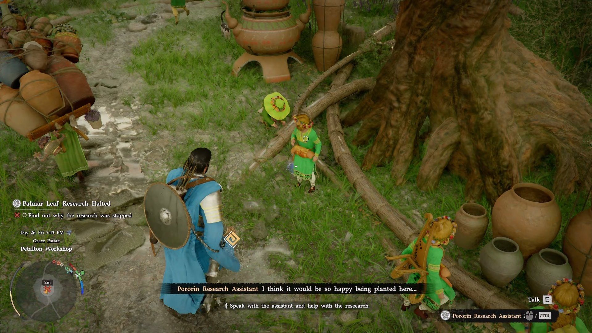 So, I followed the quest marker and found this guy, the Pororin Research Assistant, chilling under this huge tree. I talked to him, and apparently, he’s stuck on his research because he needs a Palmer Leaf. Sounds like I’ve got a new fetch quest on my hands!