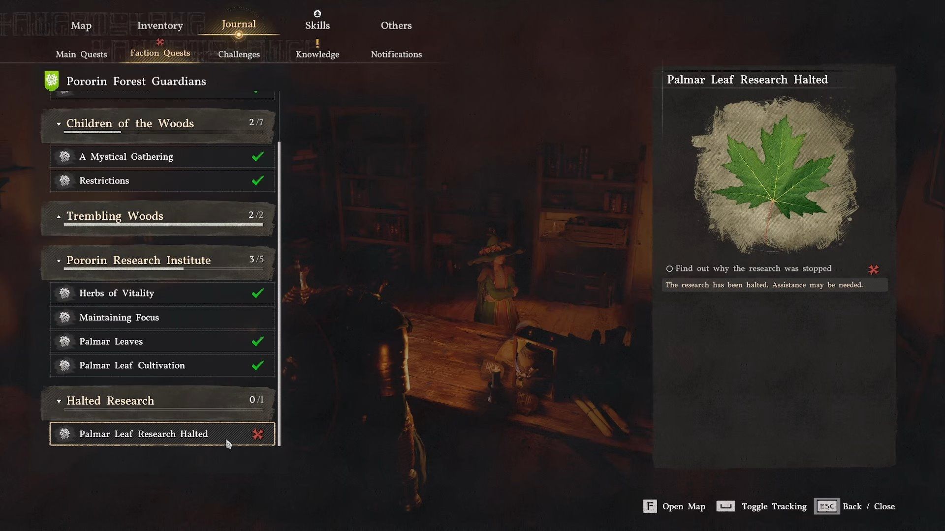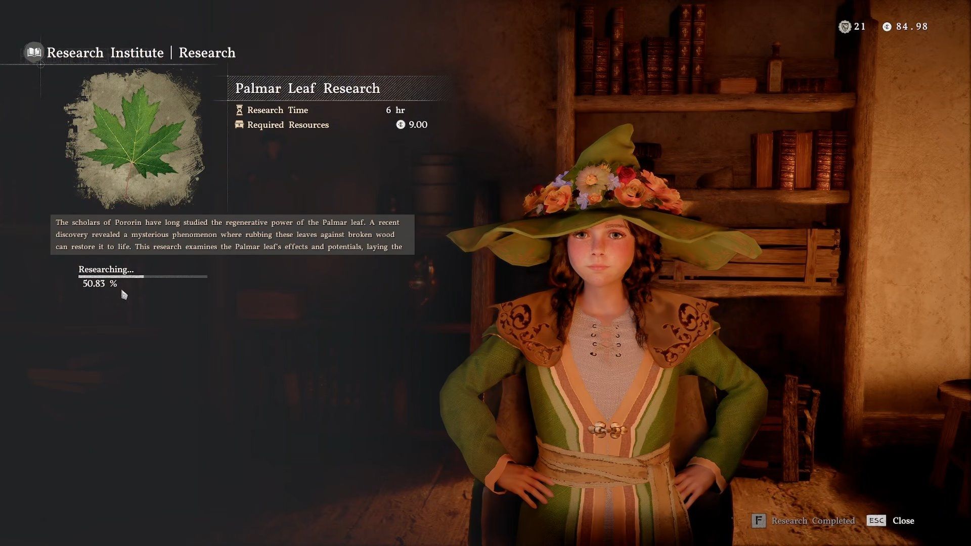 Return to the Research Institute and speak with Lumiel to access the Research Request menu. Select Palmer Leaf Research – you should see the progress bar working again. Then, simply wait for 6 in-game hours to allow the research to complete.