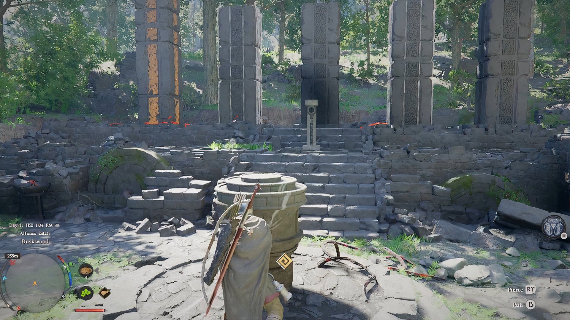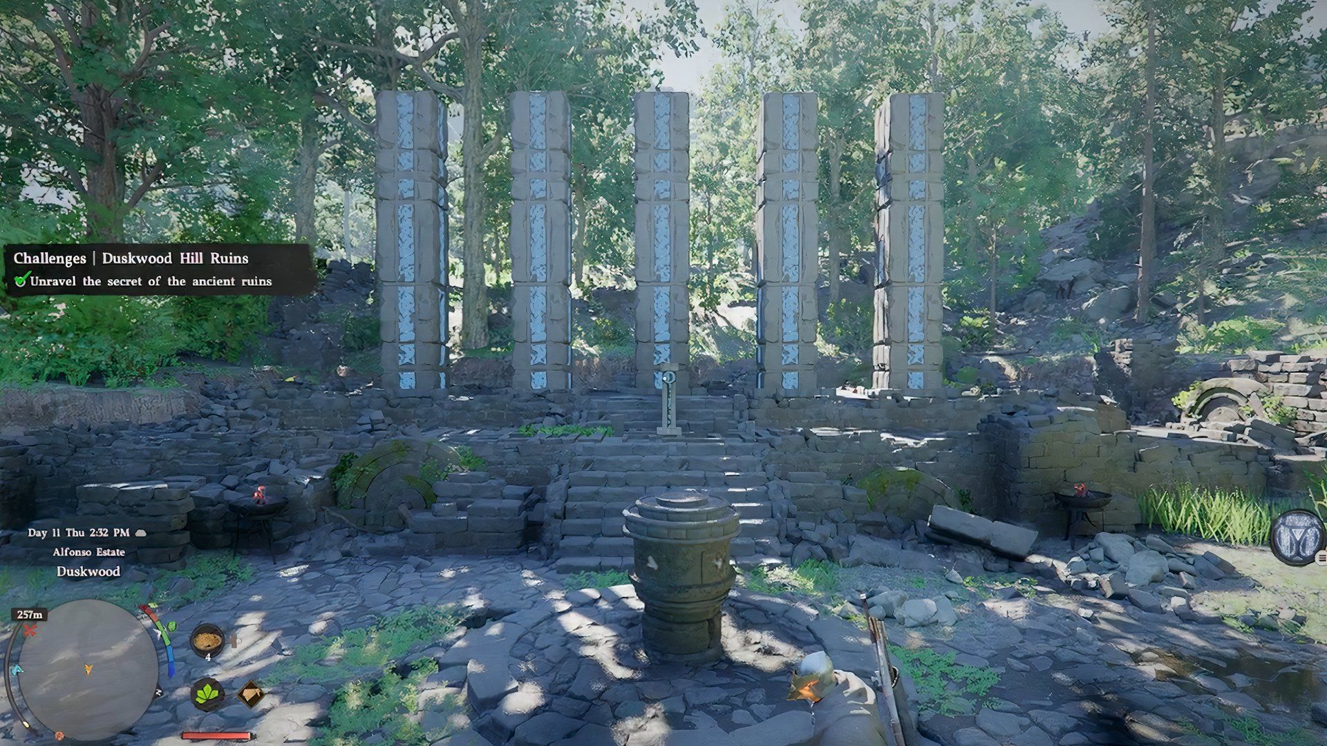 If you head north from the Phoniel Ranch, you’ll find the last Mysterious Energy source in The Witchwoods: the Duskwood Ancient Ruins. You’ll come to a place with five strange pillars and an altar in front of them. To solve the puzzle, use your Stab skill on the altar to adjust the heights of the pillars until they match the height of the pillar furthest to the left.