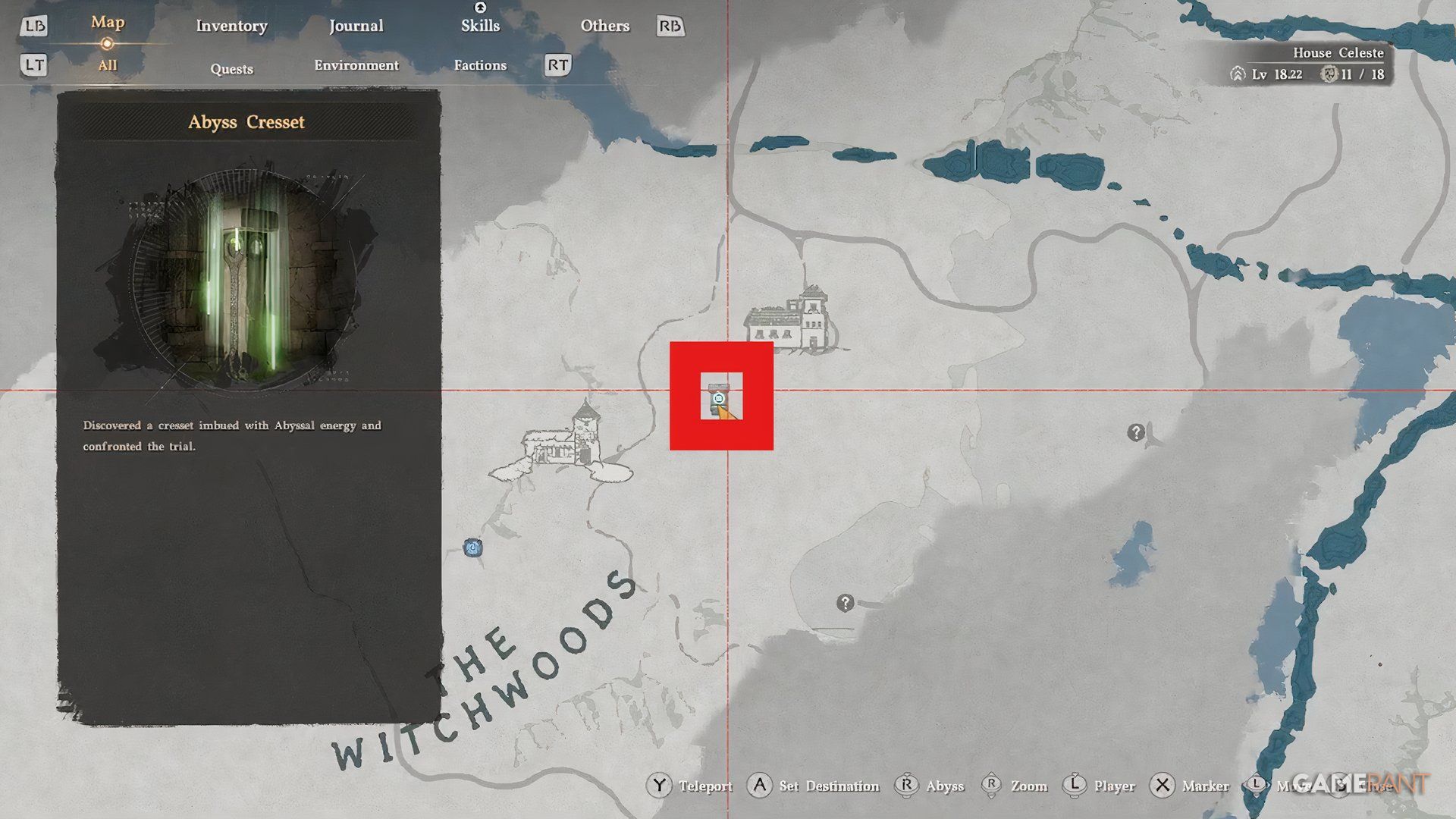 If you’re having trouble locating the Abyss Nexus, check the map for the ‘The Witchwoods’ label. The Nexus is a short distance north of the letter ‘E’ in ‘THE’.