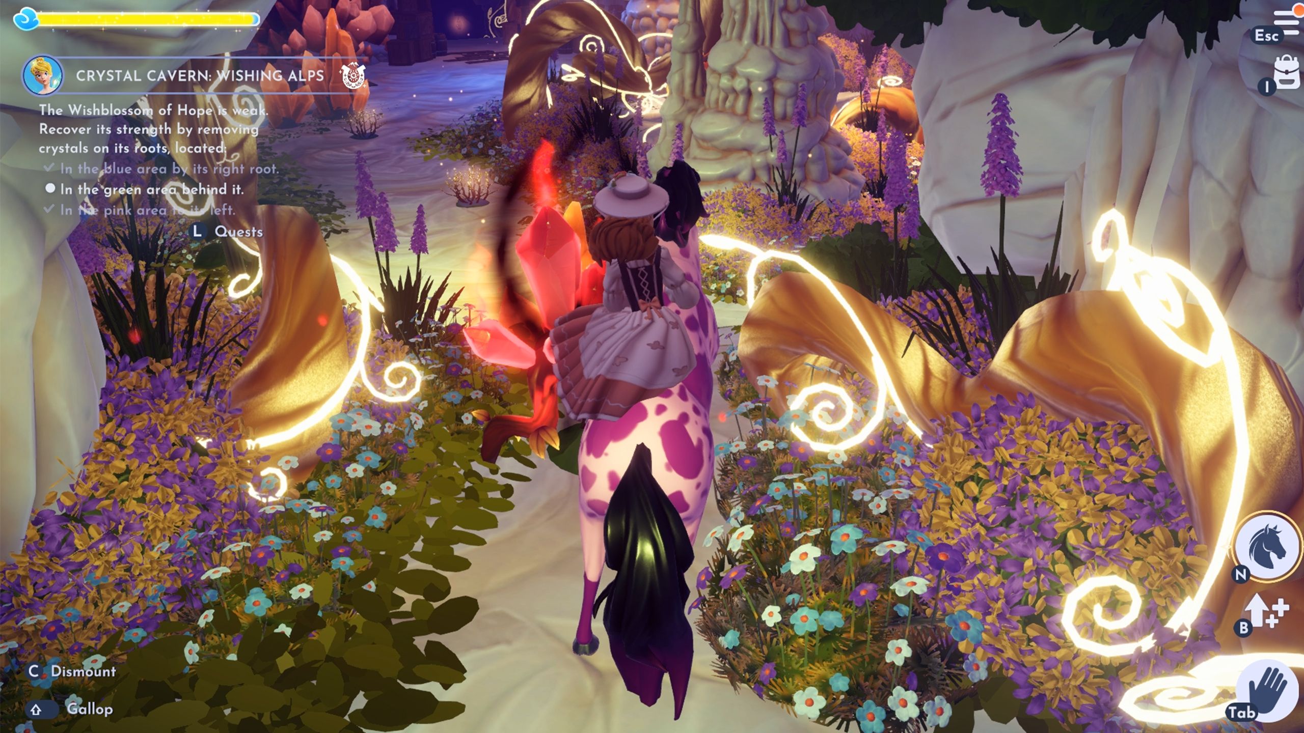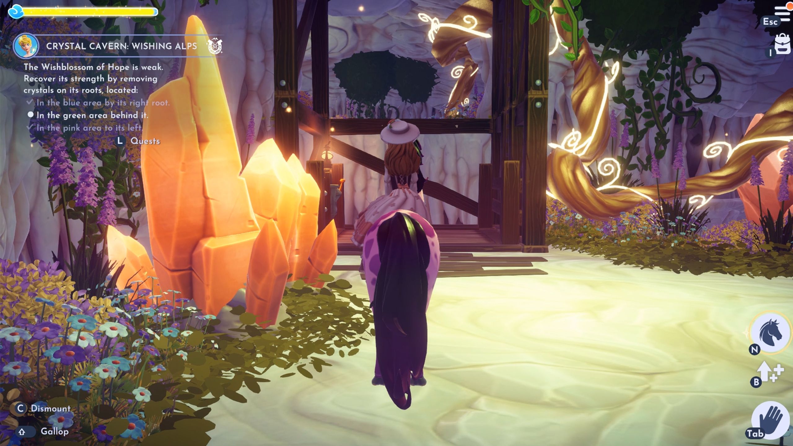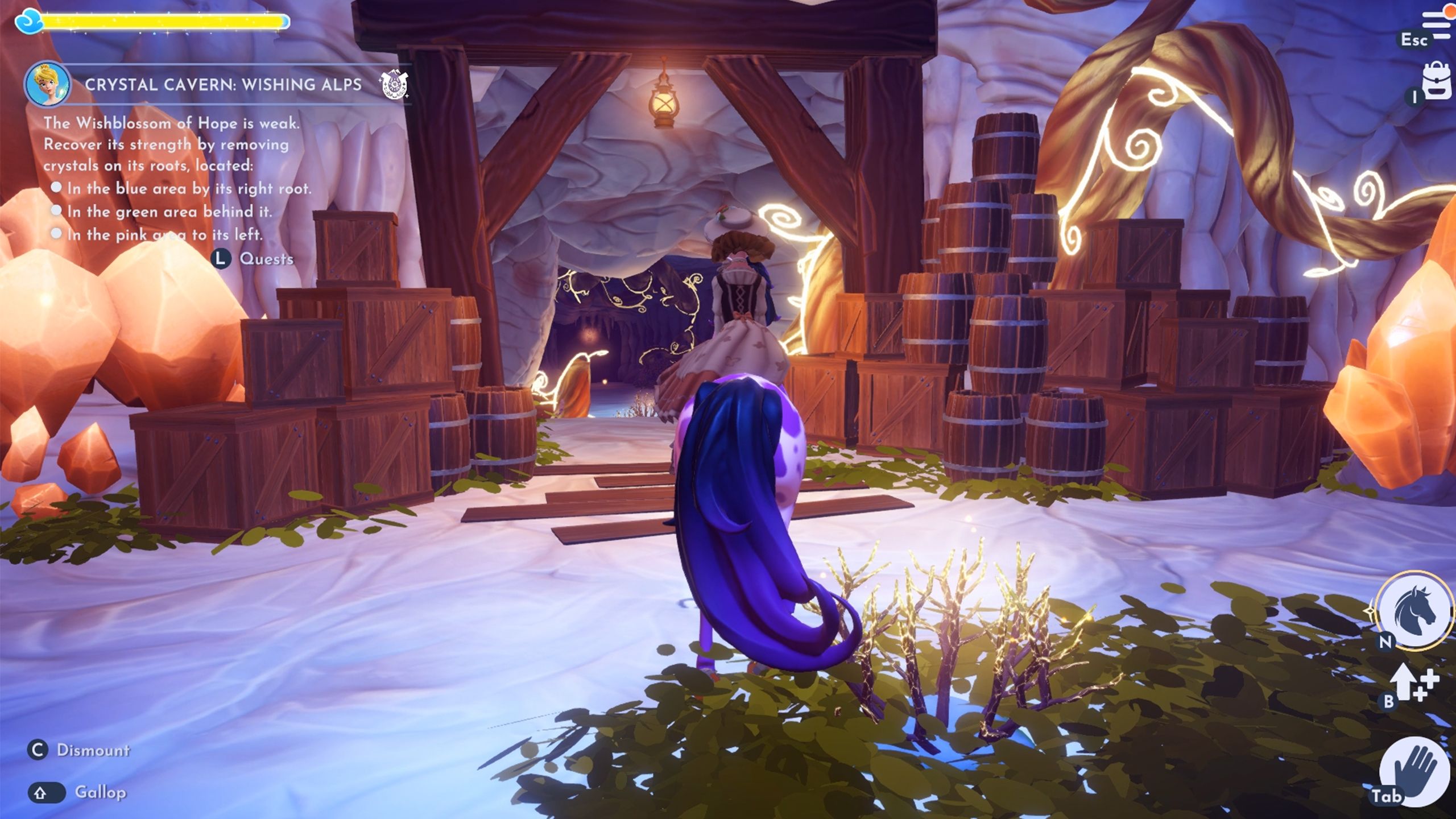 Ride Mount Maximus and use the horse to jump over the gaps to escape the Crystal Caverns. After you’re out, talk to Tinker Bell one more time to finish the “Crystal Cavern: Wishing Alps” quest in DDV.